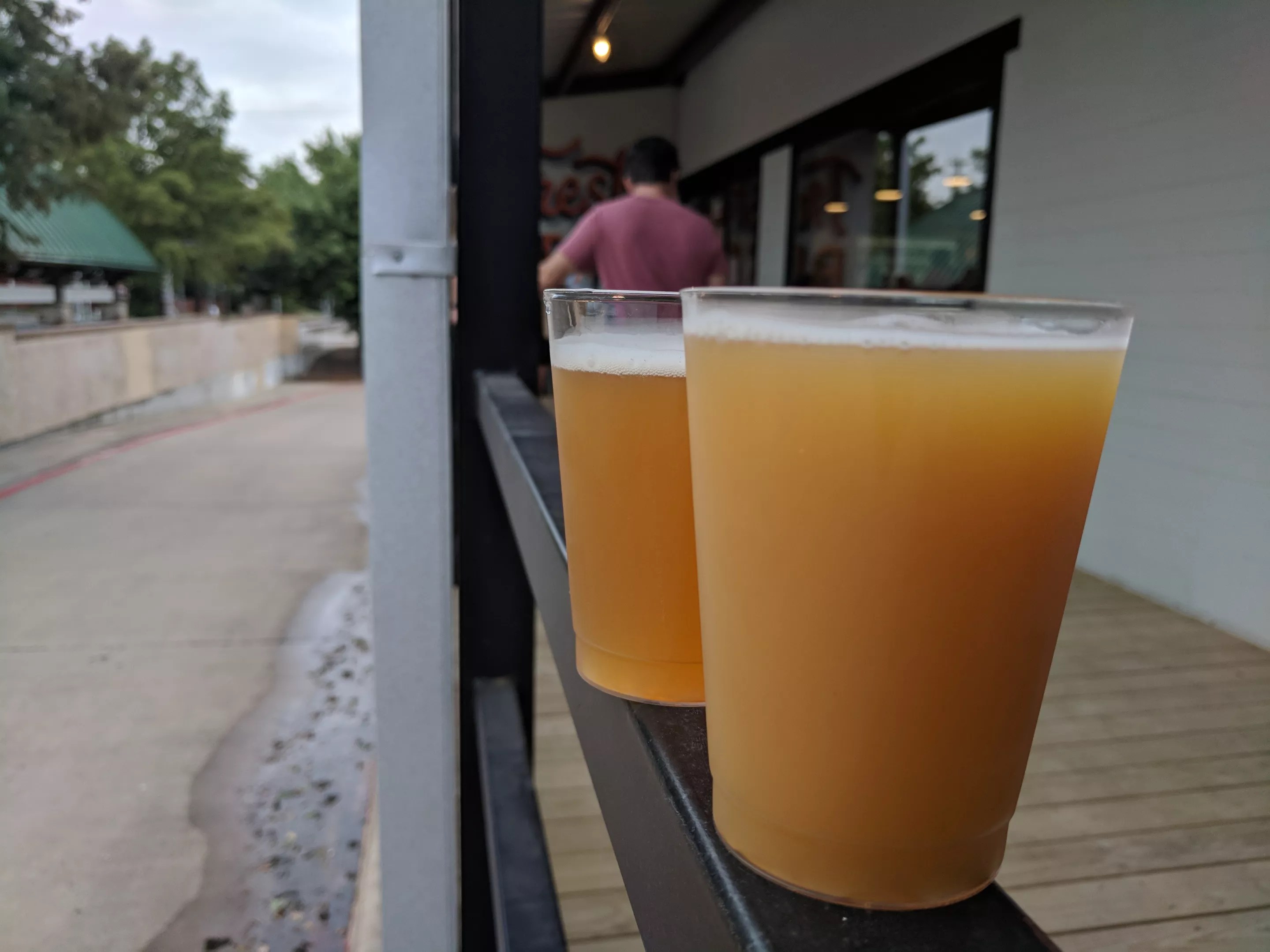 In the front, Oak Cliff’s New England IPA. In the rear, the farmhouse saison.