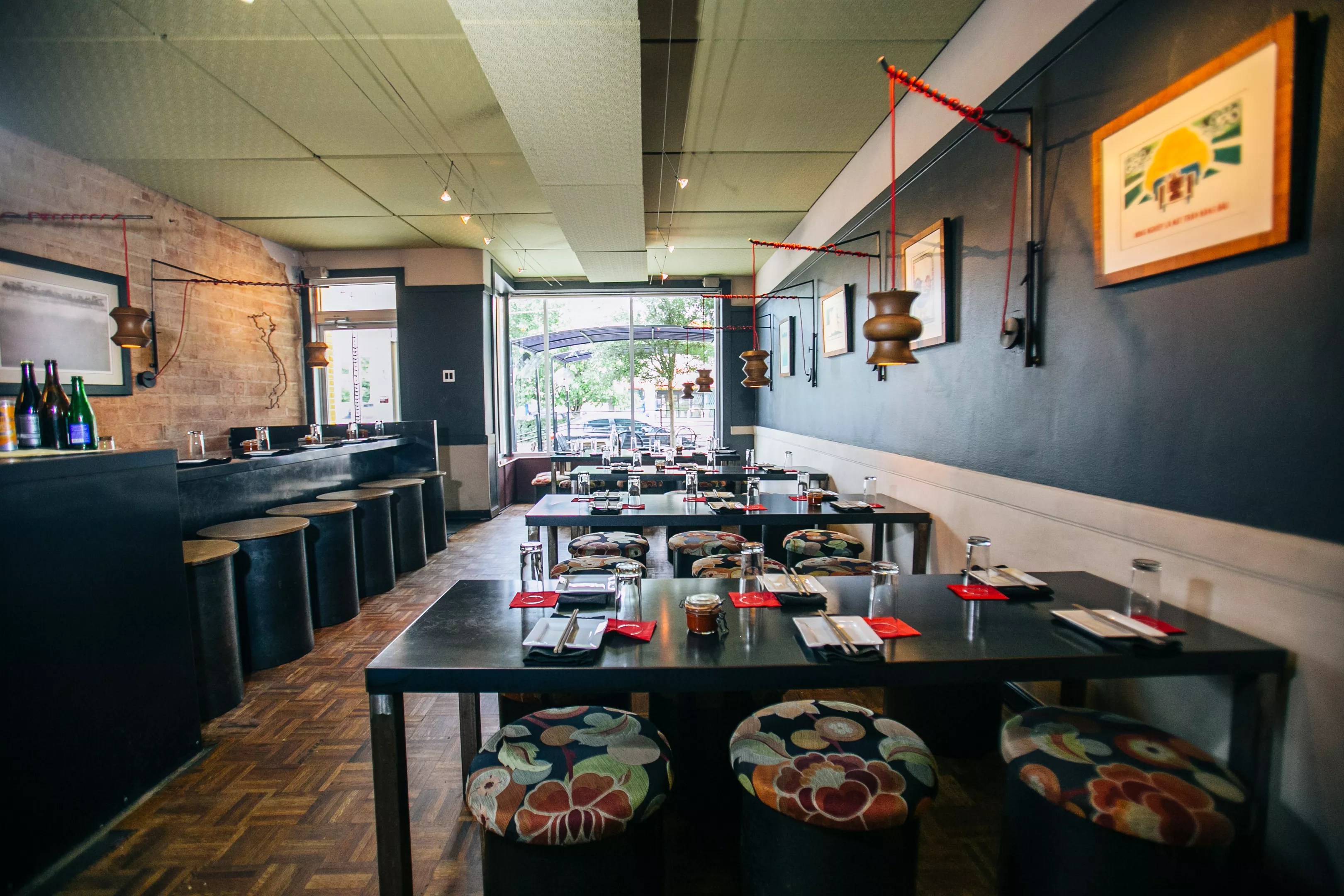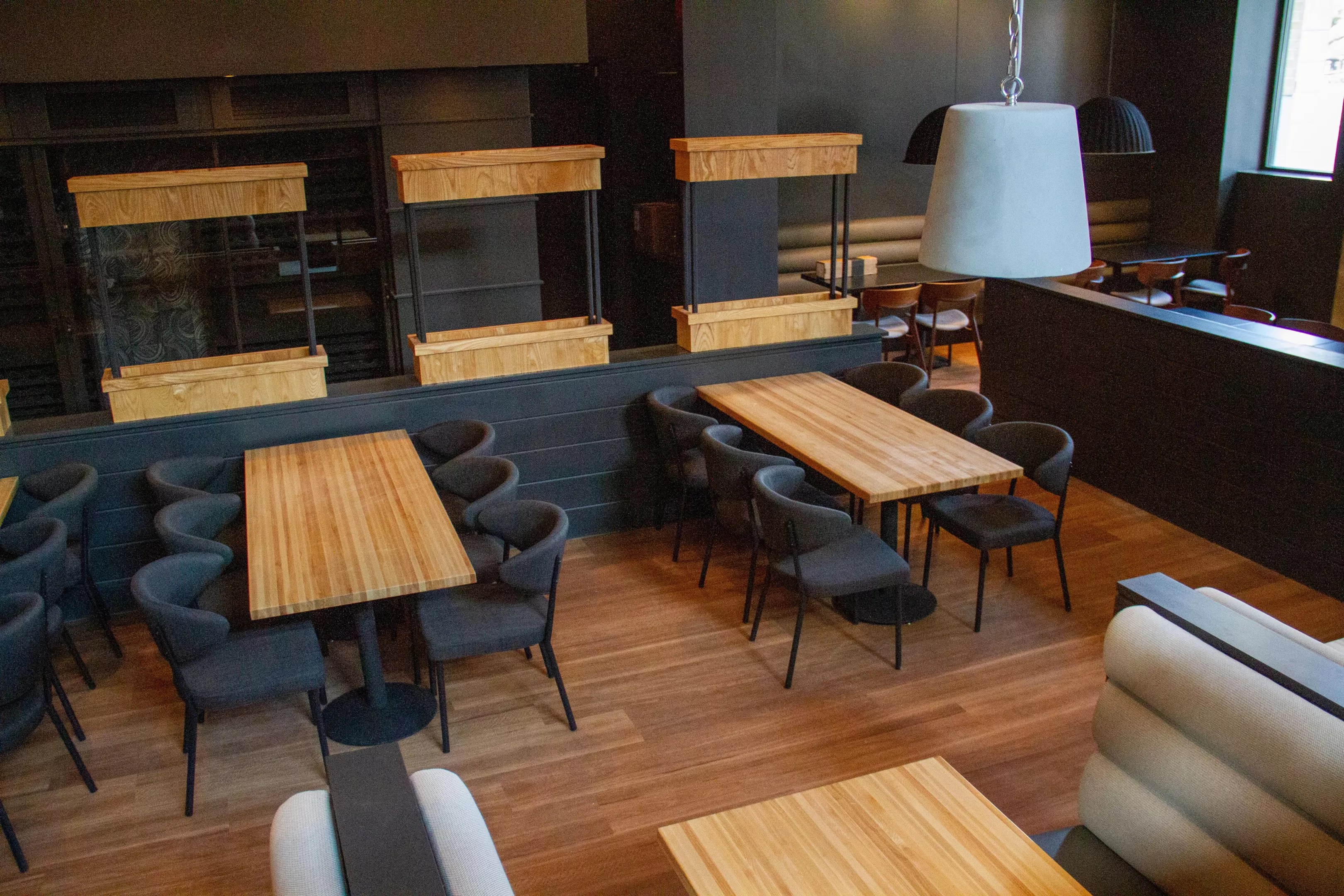 The space looks different compared with the previous, very red-orange decor that was there. Dark colors, black, gray and wood go throughout. Once the place opens in March, we’ll see pops of red on the wall with a collage of plates and vibrant plants hanging in different areas.