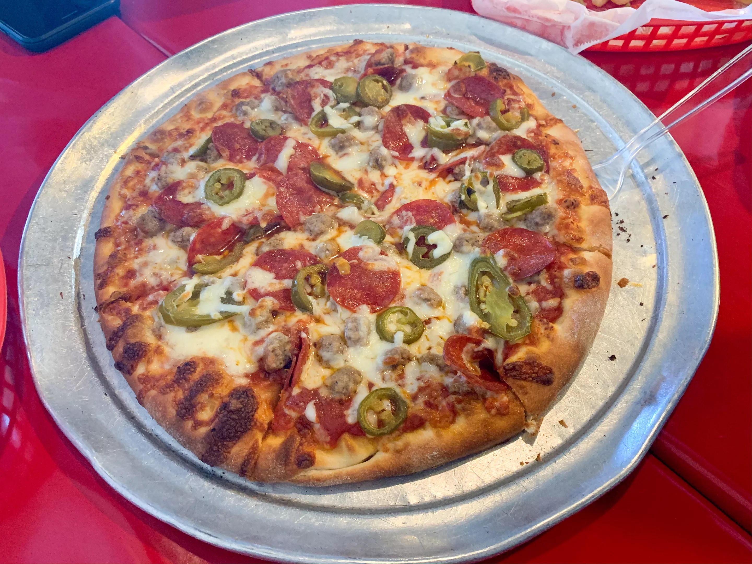 The name of the place had us ordering a pizza, going with some sausage, pepperoni and jalapeño slices — that’s the dealer’s choice (a large with sausage and pepperoni, $14.99) with the added heat. It’s perfectly fine, a thinner crust that crisps well on the bottom edge while allowing a softer top to house the ingredients sunken into cheese.