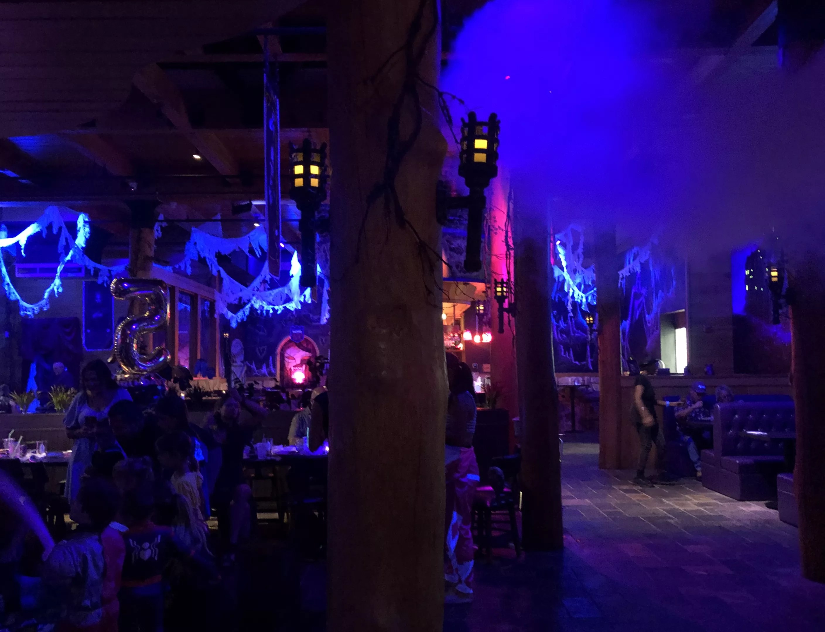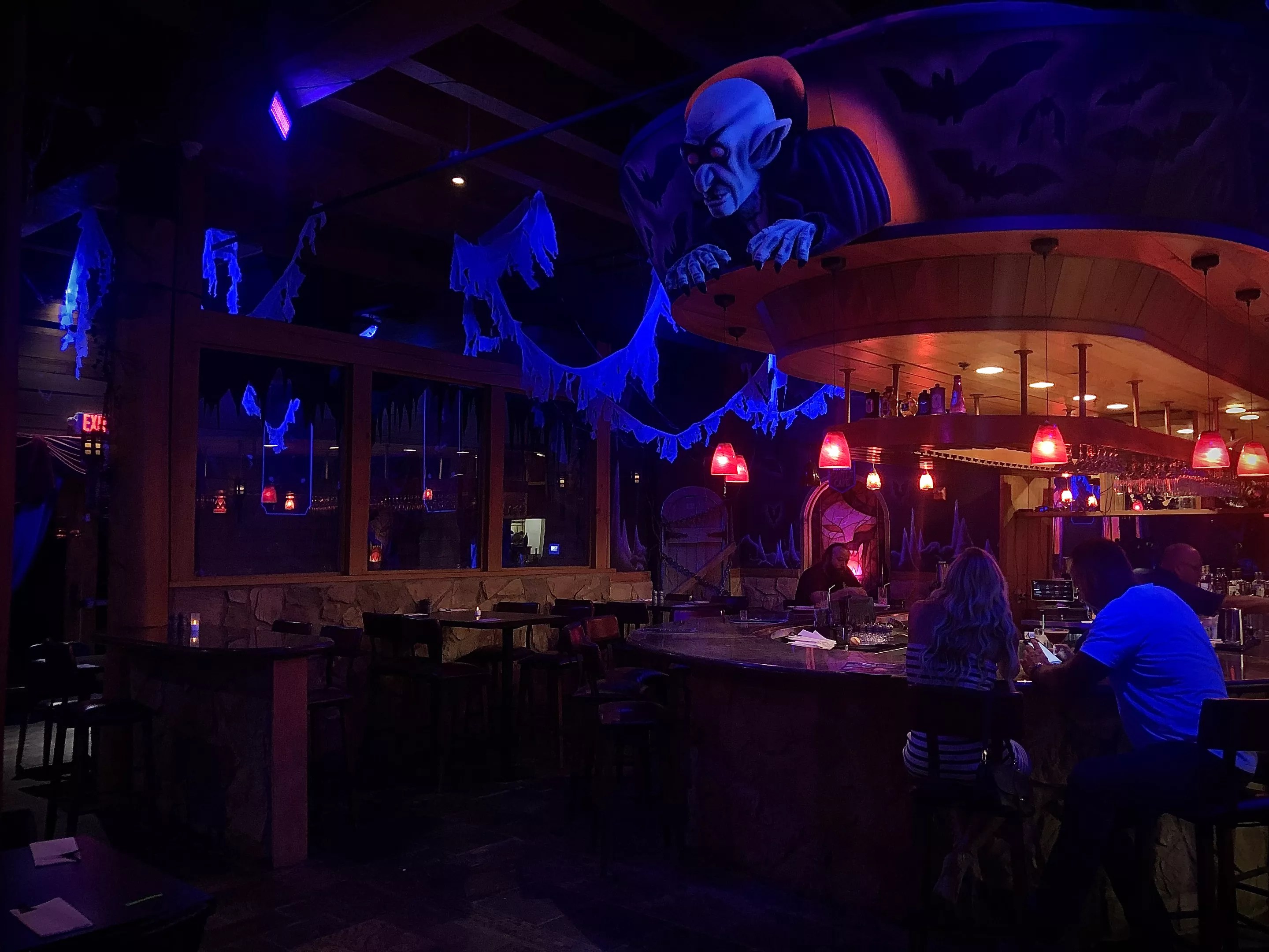 As we entered, our eyes adjusted from daylight to the restaurant’s decorations glowing under blacklight: faux cobwebs, life-size figures of characters from horror movies, coffins and lush, gothic-inspired furniture in the waiting area. What it’s done with its 10,000-square-foot space is fun and immersive.