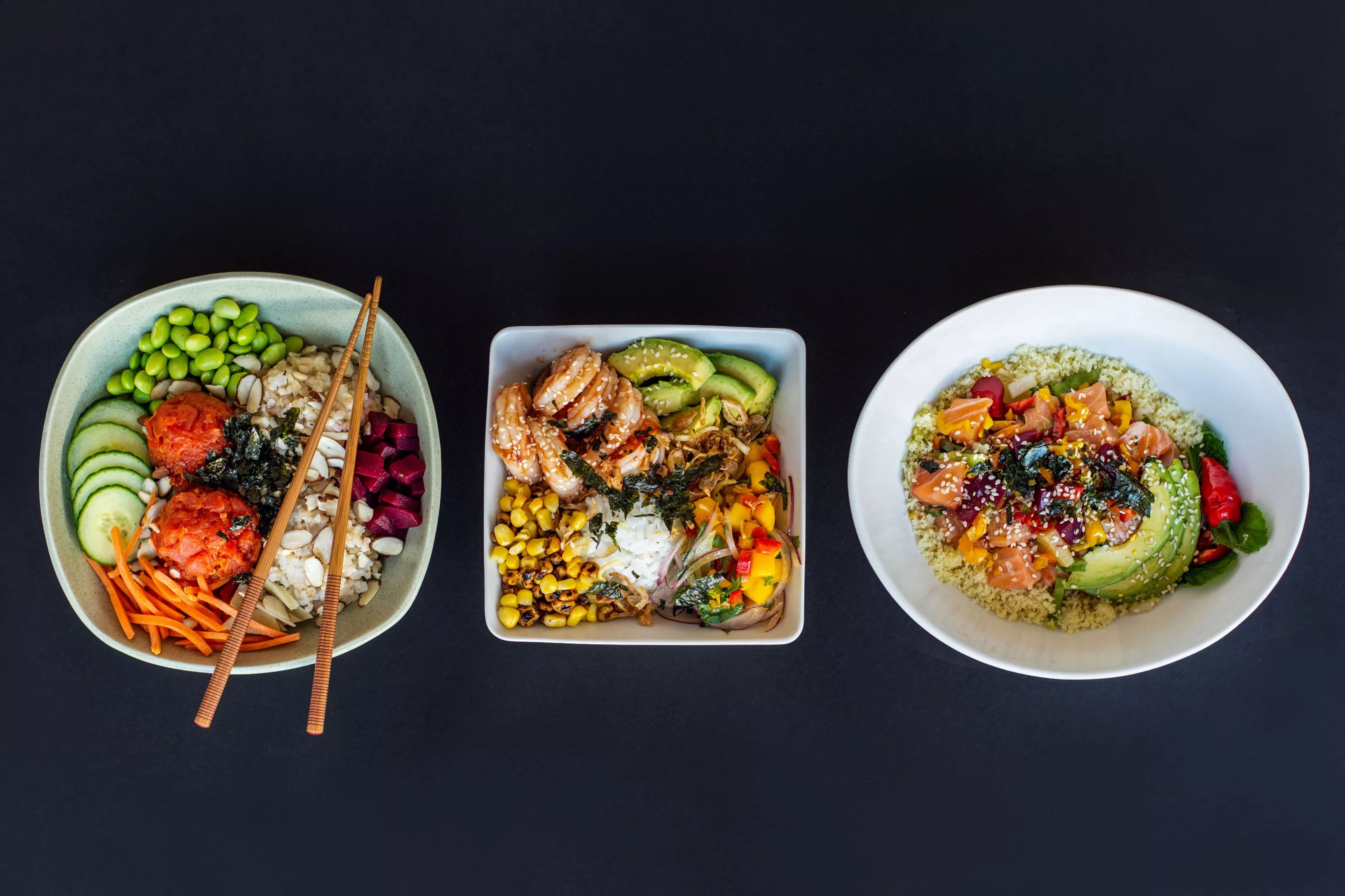 For Reguieg and co-owners Zuhair Al-Shawwa and Hamid Mehvari, fish is adaptable and the pairable ingredients are boundless. On the menu, you’ll find a Mediterranean salmon bowl with couscous, yellow radish, pineapple, bell peppers, avocado, sweet onions and mint in a chili lime sauce. There’s also a Tex-Mex shrimp bowl stacked high with roasted corn, red onions, cilantro, mango salsa, avocados and crispy onions in a Sriracha-macha sauce. There’s even a vegan-friendly bowl with tofu, cucumbers, edamame, mango and shredded coconut. You can always create your own with additional proteins such as tuna, spicy tuna or yellowtail.
