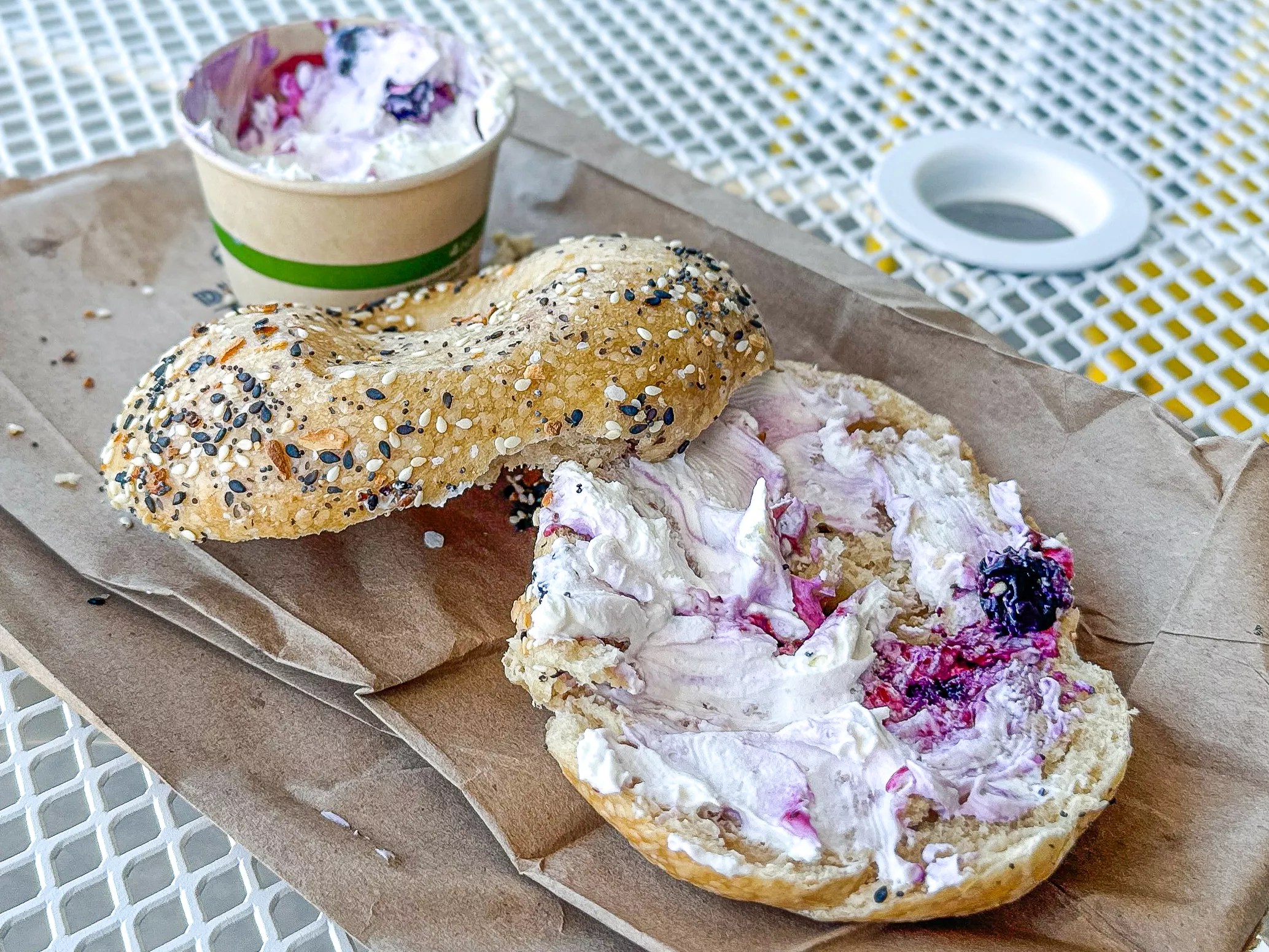 Blueberry swirl schmear on an everything bagel at Lubbie’s.