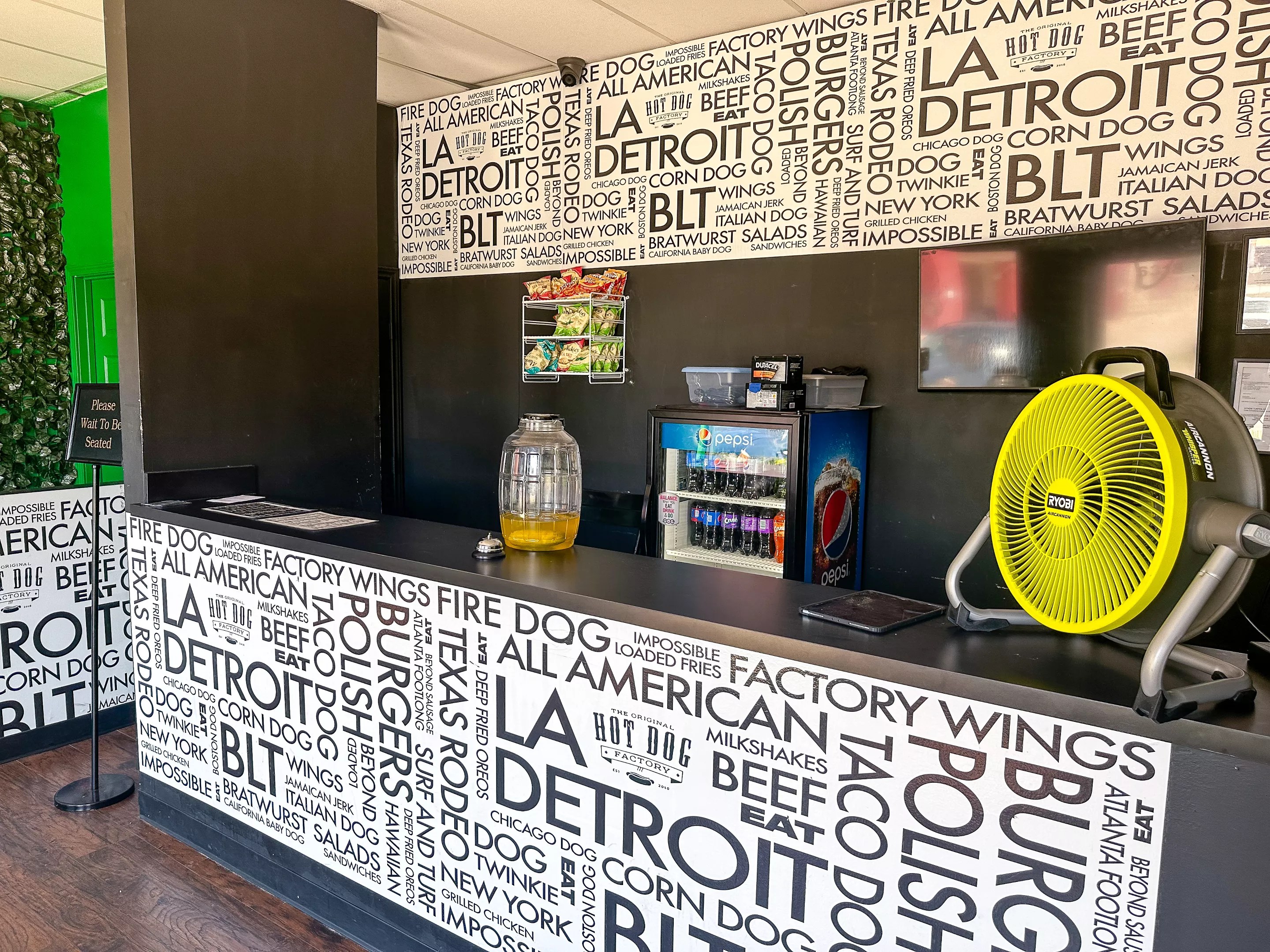 This location has been open for about three months, and it still getting its bearings. The spot shares space with a hookah bar, and you have to ring a bell at the restaurant counter to let them know someone wants to order a dog. One assumes that, eventually, they’ll be able to hire more people, but that’s the situation right now. The A/C also needs to be fixed or recharged, but they do have a plethora of fans sitting about the dining area, the seating for which consists of your basic hot dog-joint counter that you can either stand at or sit at on a stool.