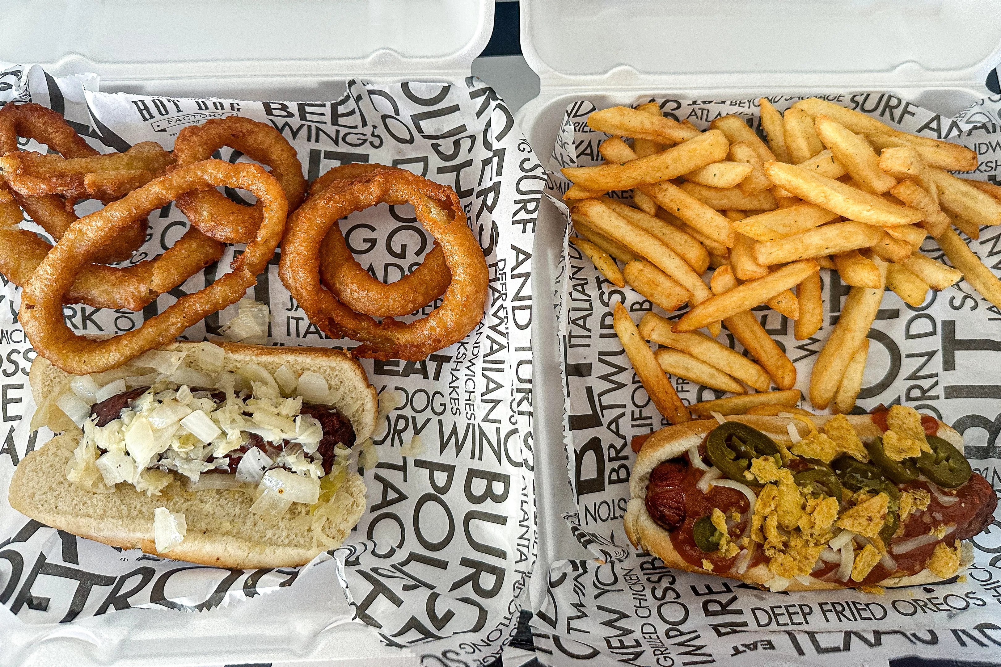 The street Polish was … well, as it turned out, they were out of Polish sausages that day, so we quickly pivoted to the bratwurst dog: a deep-fried brat topped with sauerkraut and grilled onions, ordered with a side of onion rings.