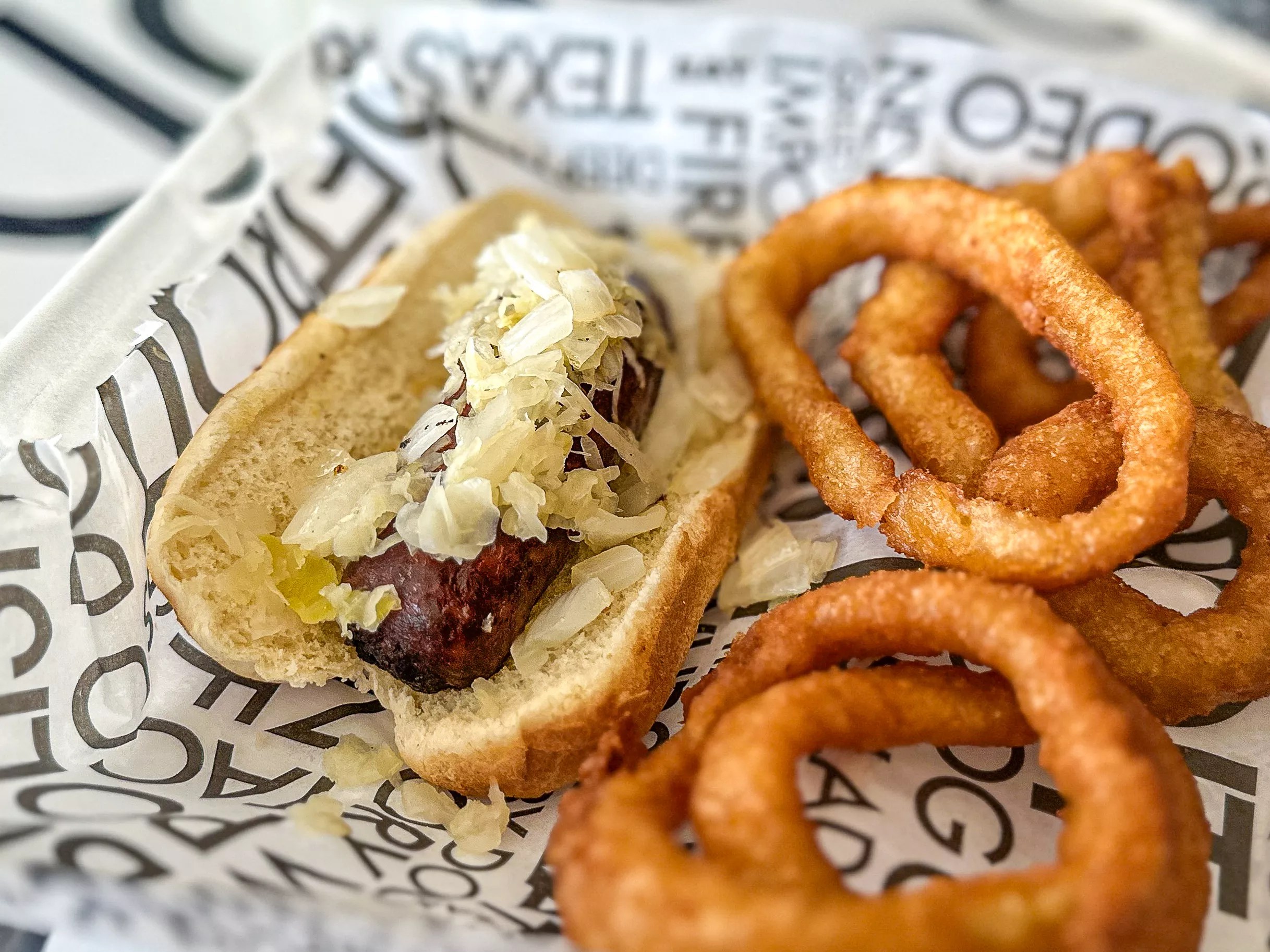Deep-fried bratwurst topped with sauerkraut and grilled onions, with a side of rings.