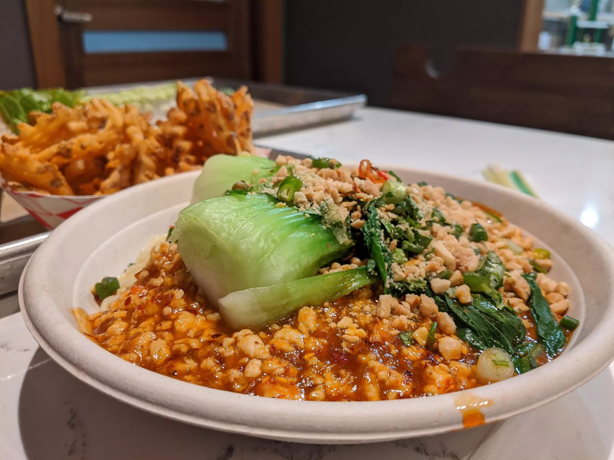 Those “damn damn” noodles, though – they aren’t joking around. This is not spicy-for-people-who-can’t-handle-spicy food. This dish brings straight up for-real heat. Ground chicken, scallions, peanuts and a single baby bok choy cut in half are the only distractions from this eater-vs.-food battle with hot pepper and ramen noodles ($8.95).