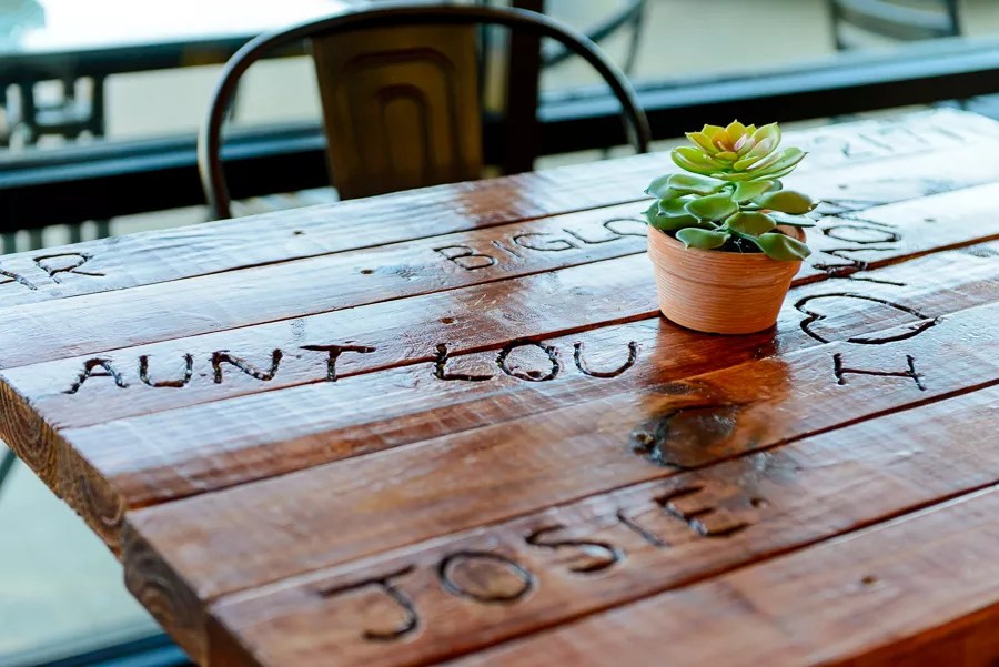 Winston carves names and numbers into the restaurant’s tabletops.