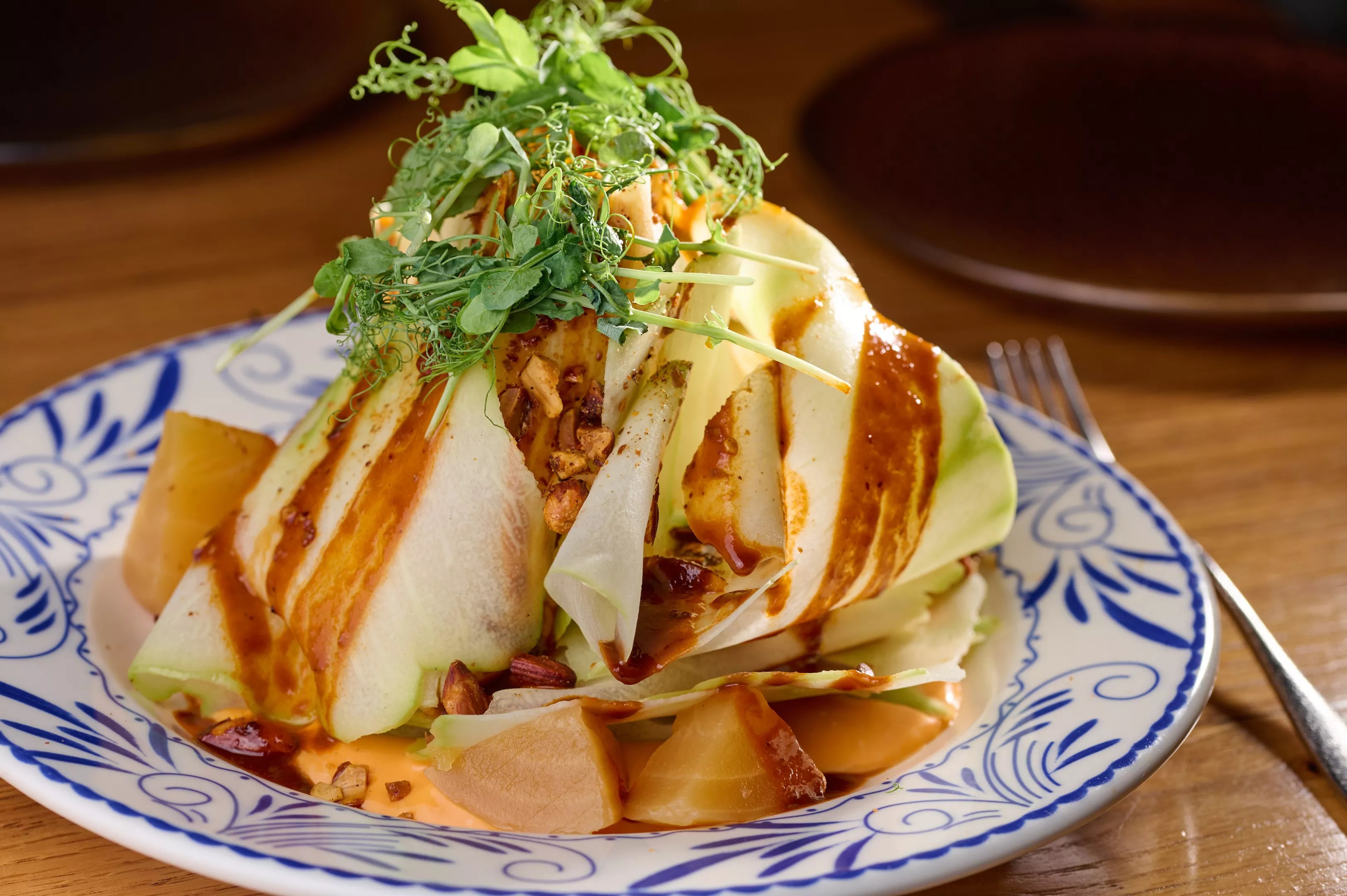 The dramatic chayote salad with golden beets and a goat cheese puree.