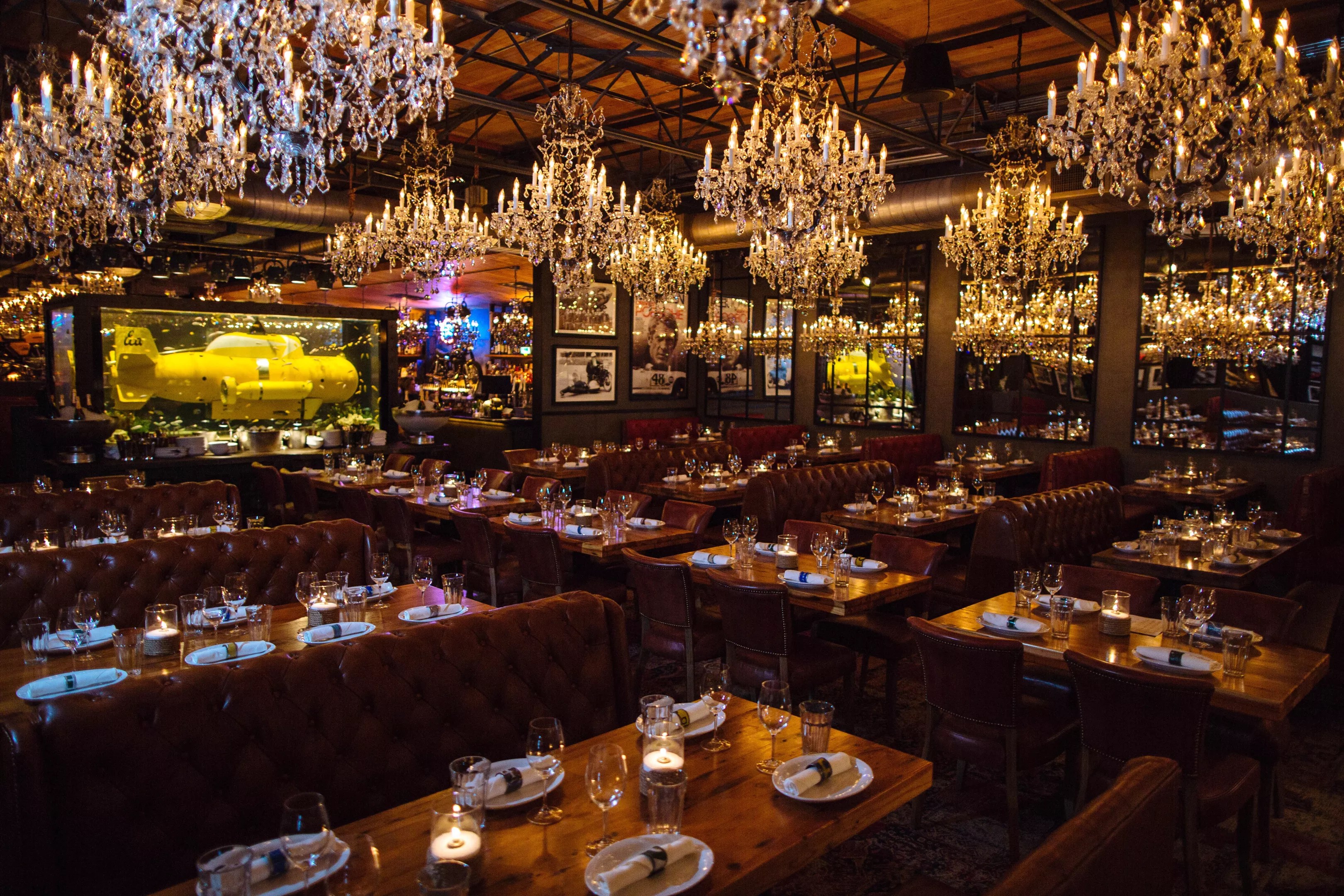 Town Hearth’s over-the-top decor has it all, from 64 ornate chandeliers to vintage Ducatis mounted above the bar to vintage sports memorabilia and even a minesweeping submersible in a custom-made tank.