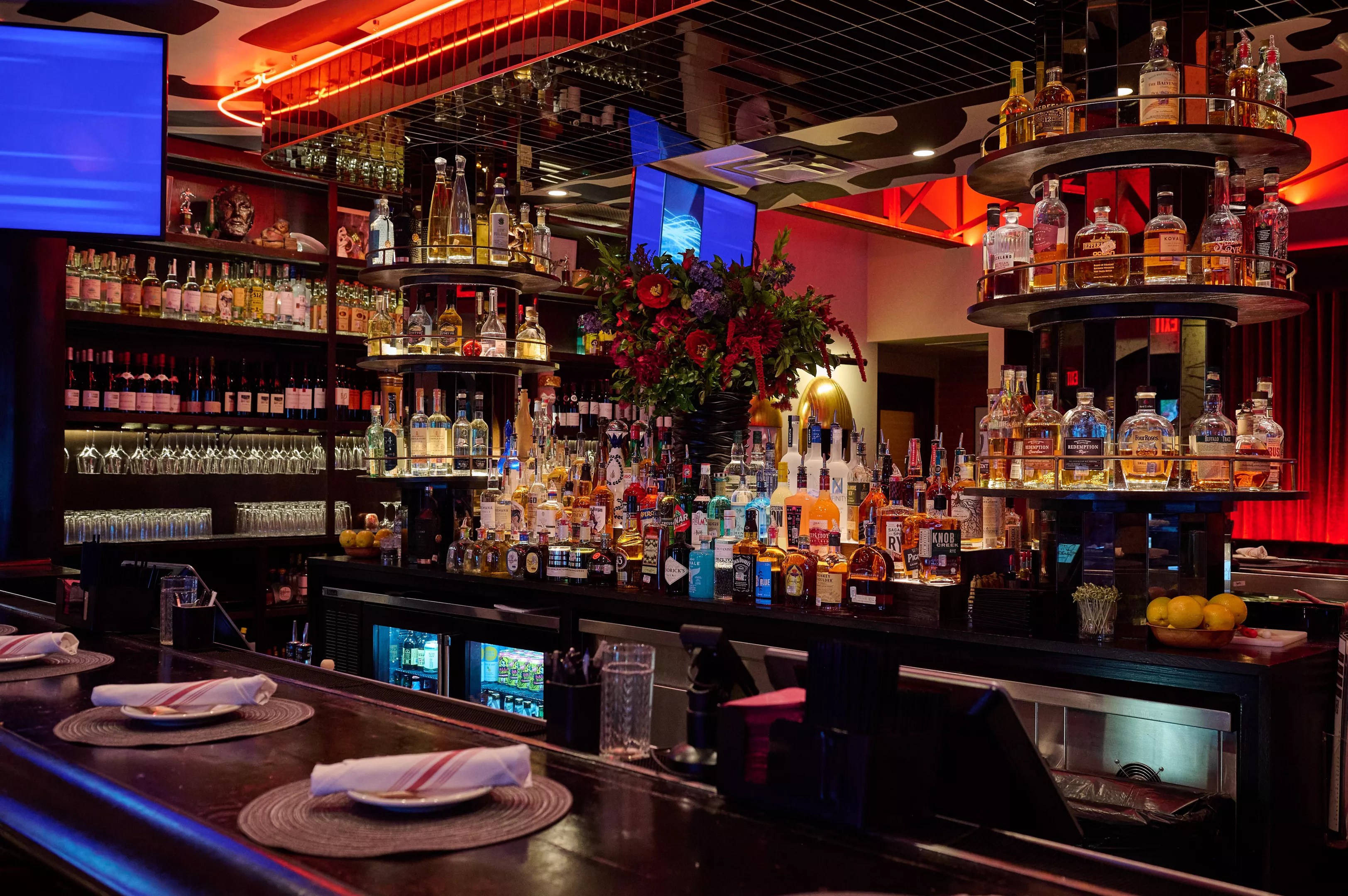 Sfuzzi’s interior is dominated by a large U-shaped bar, with roomy semicircular booths lining the walls and high-top tables filling the aisles. Black and white are the primary colors; come dinner time, the space is predominantly illuminated by red lights and neon. Forget trying to Instagram your food, because every photo will be cast with a red hue, as if you’re eating in a submarine.