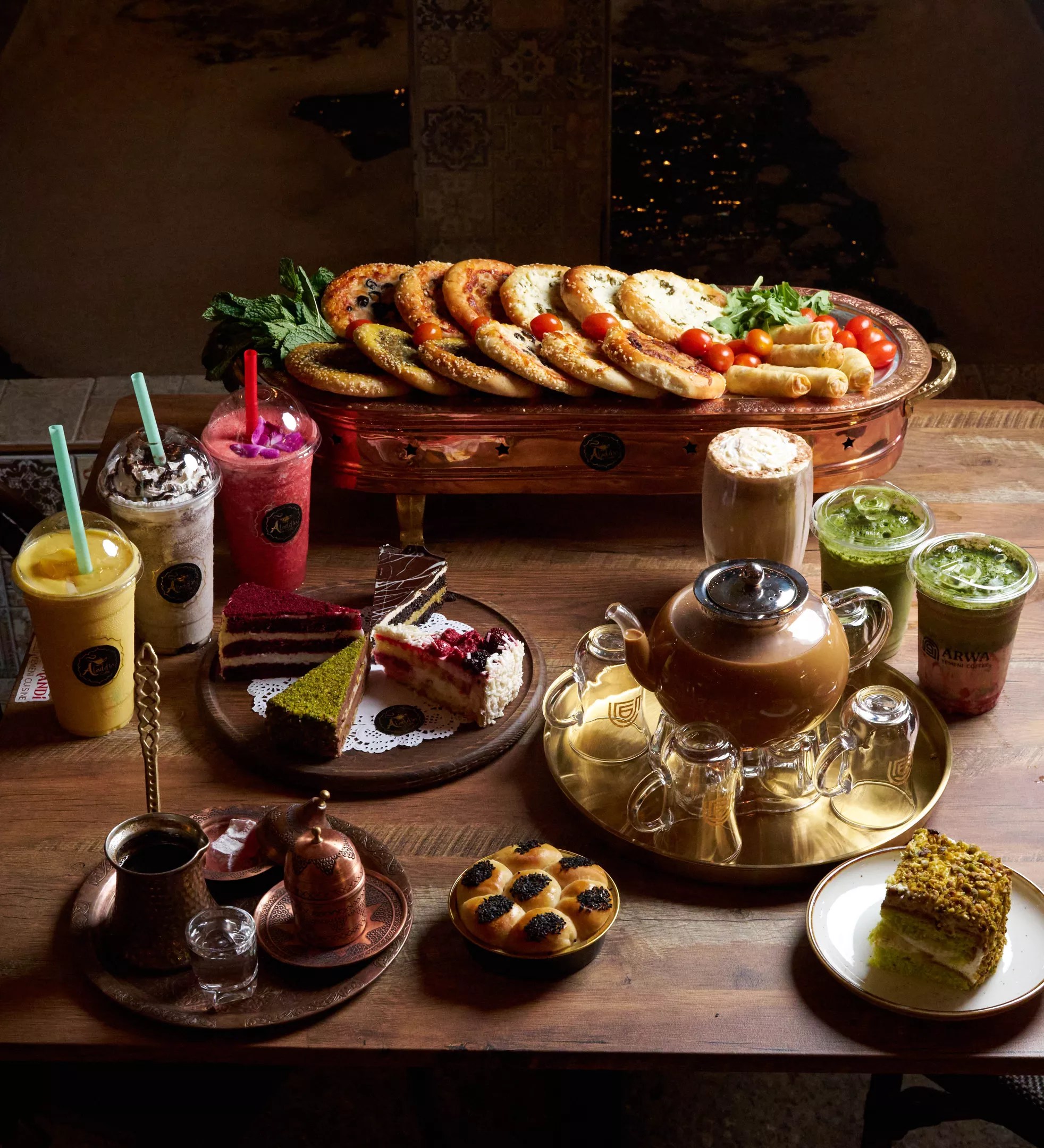 A mix of dishes from Arwa Yemeni Cafe (iced drinks, coffee, pistachio cake, and honeycomb bread) and Aladdin Cafe (smoothies, cake slices, coffee).