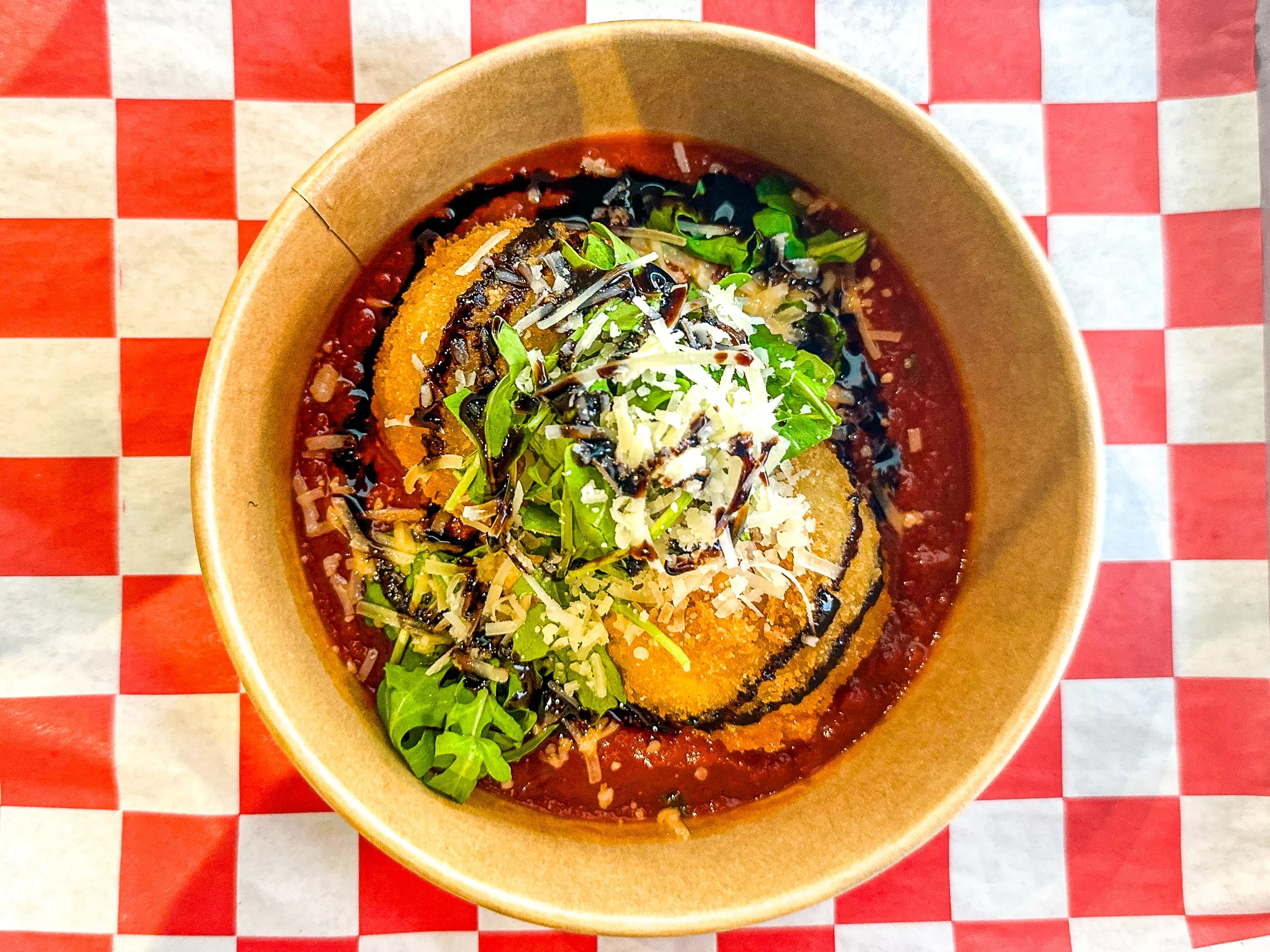 #29, Crispy Caprese: Fried Burrata, Tomato Sauce, Arugula, Aged Balsamic.