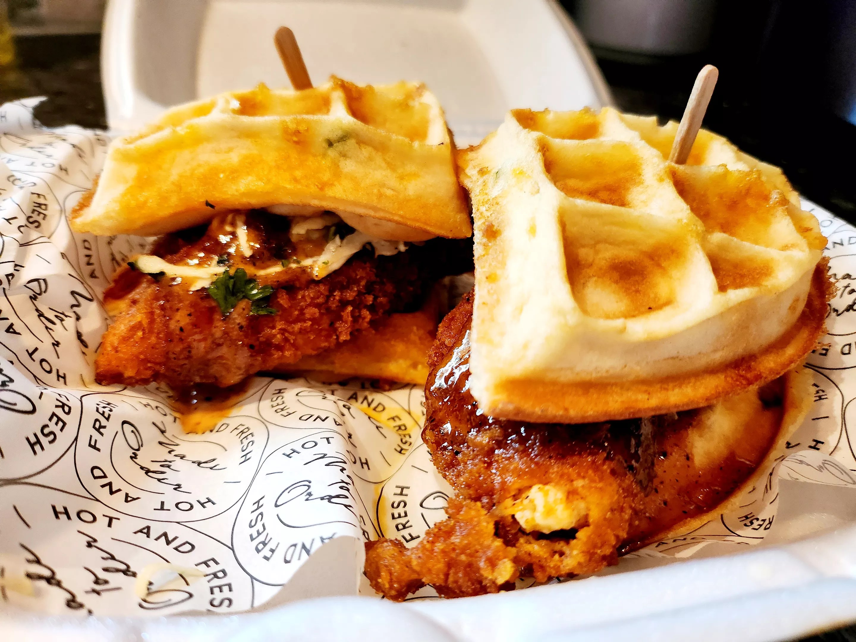 Next, we went with the Waff-Wich ($13.99). This spirited waffle sandwich is spicy chicken on two fluffy cheddar jalapeño Belgian waffles topped with vinegar slaw, pickles and comeback sauce, then finished with a subtle touch of maple syrup.