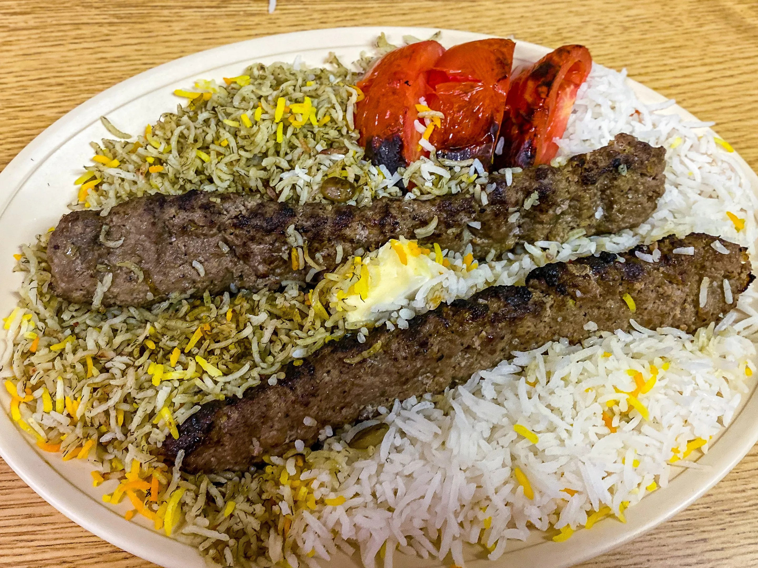 They were. The chicken (pictured at top) was also perfectly grilled, chunks of juicy white meat that had a fire-charred taste. Both came with two skewers worth of meat that had been removed prior to serving. The baghali rice was an interesting mélange of flavors with a light and fluffy texture. Each plate included several slices of fire-roasted tomatoes that added a burst of color as well as flavor. Rounding it off was a plate of accouterments that included pita quarters, limes, raw jalapeños and onions.