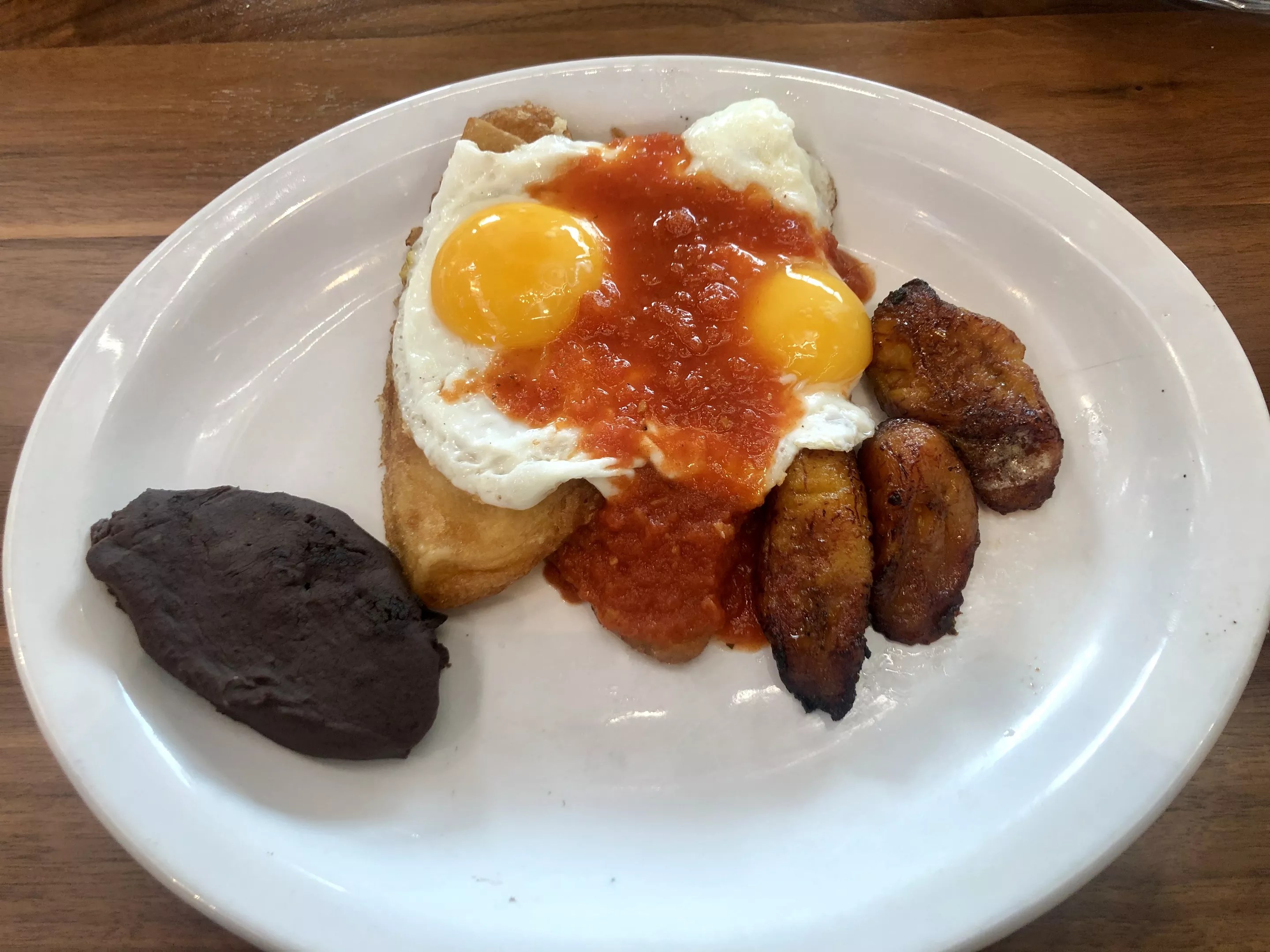The Dobladas Breakfast, a Guatemalan breakfast with two corn tortillas stuffed with melted cheese, topped with eggs and ranchera sauce