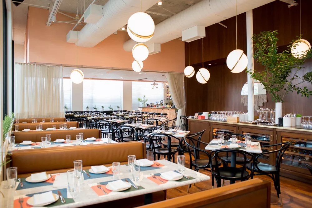 Step inside the restaurant’s enormous, awkwardly heavy door, and everything about the dining room is fun. The color scheme, a muted dining room in tasteful midcentury modern style set off by flashes of forest green and salmon, is cheerful. A wine storage island in between tables hints at temptation. Over the bar’s mirrored back, long rows of liquor and wine bottles glow like boozy beacons in a wash of sunlight.