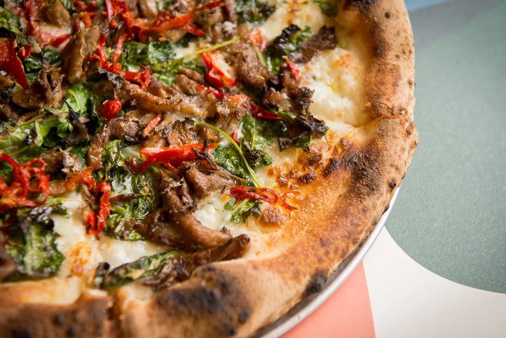 The balance of savory flavors, spice and creamy mozzarella is spot-on for the pizza with oyster mushrooms, kale and sliced red chile peppers ().