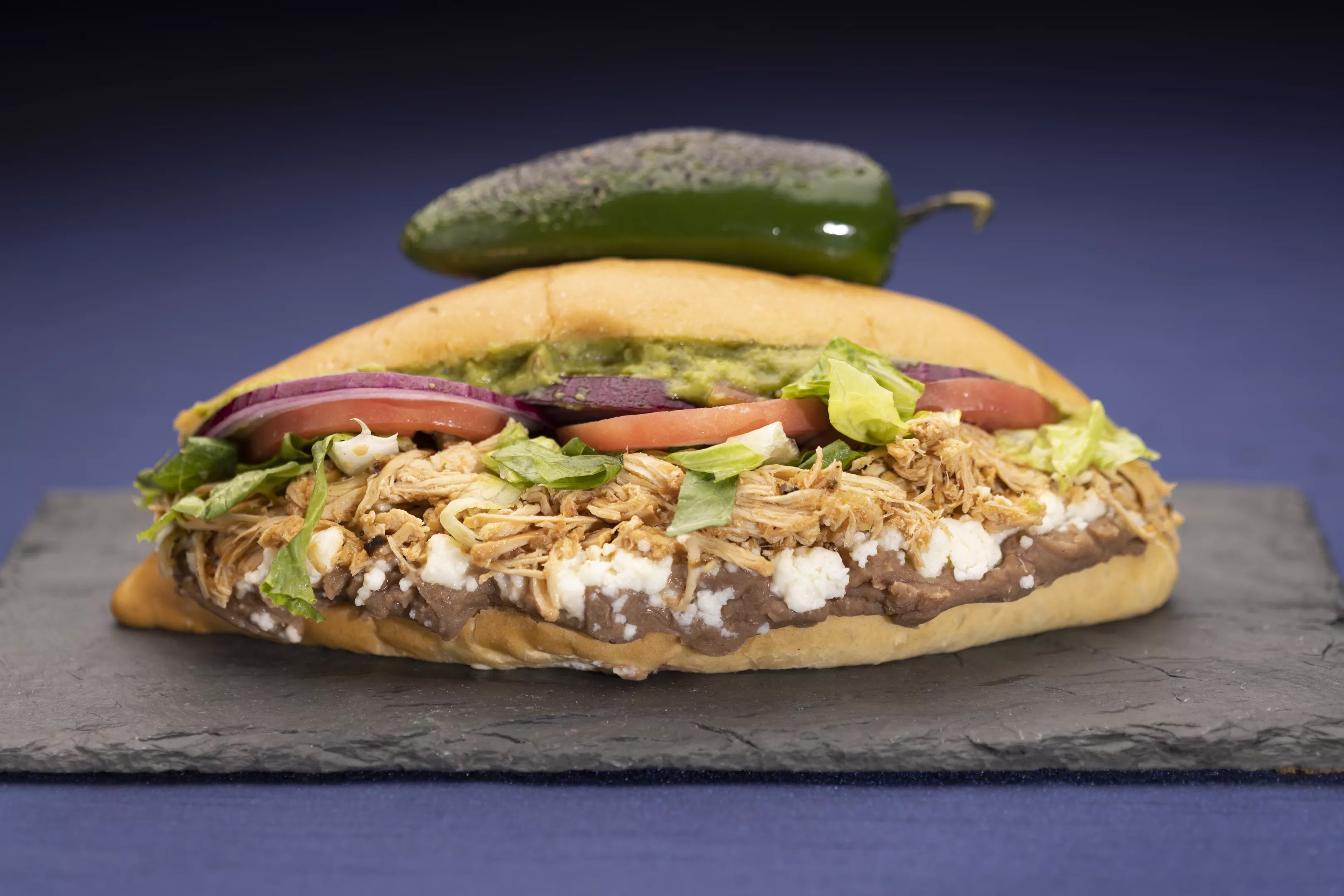 Track down a Vaqueros’ stand for a torta made with a bolillo bun, layered with refried beans and chicken, barbacoa or pastor, and topped with queso.