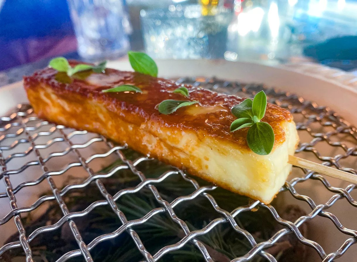 We had a caipirinha (the official cocktail of Brazil) while we waited, and a beer with the burger along with a side of the yuca fries served with garlic aioli ($7). We added some beach cheese too, because any time you have a chance to get beach cheese, you simply should. This skewer of warm cheese is drizzled with a bit of hot honey and has slightly crispy edges, all of which is served over a small grill with herbs below to mimic a beach cookout.