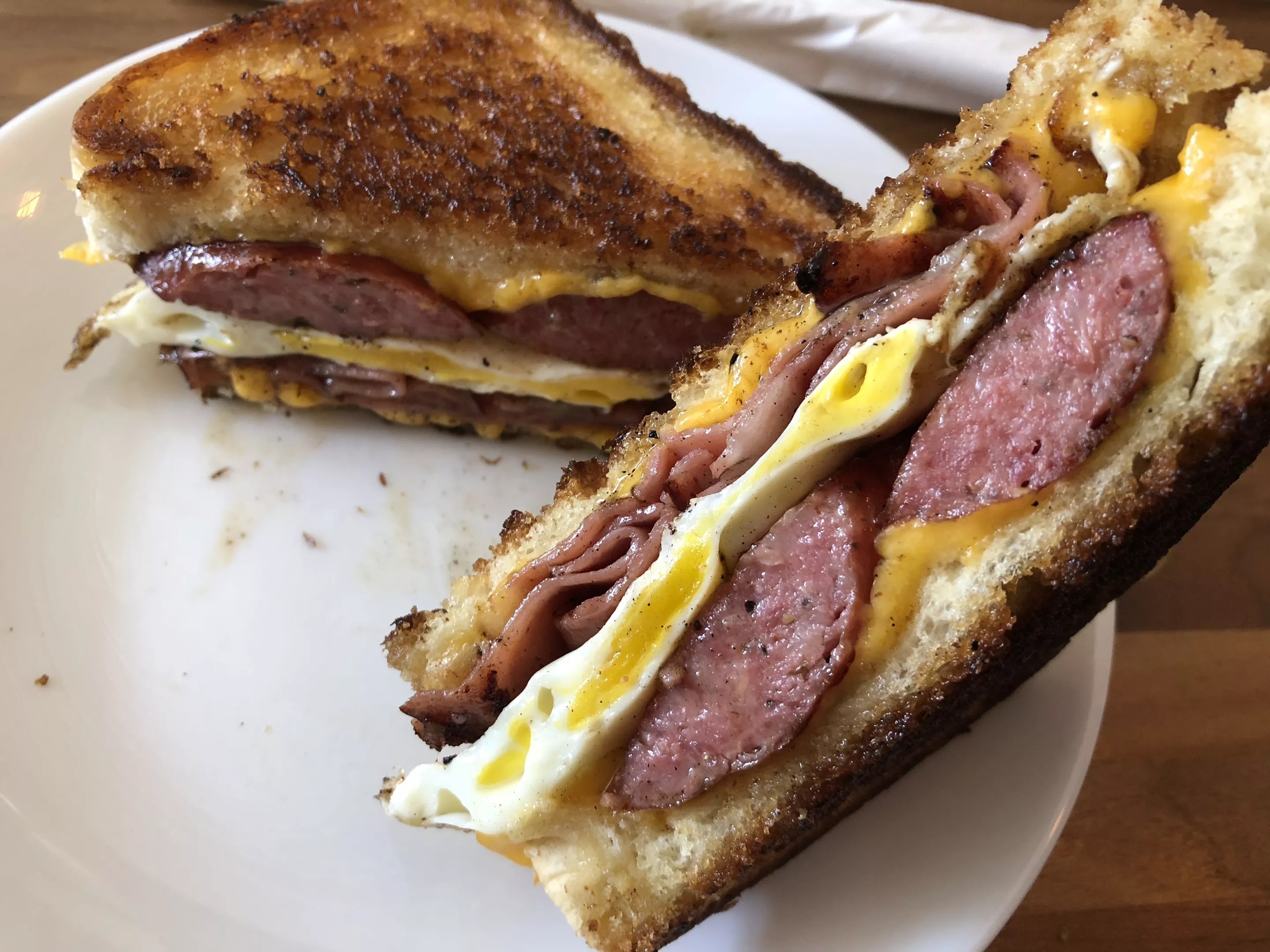 Griddled bologna, sausage, fried egg and melted American cheese make this the ultimate breakfast sandwich.