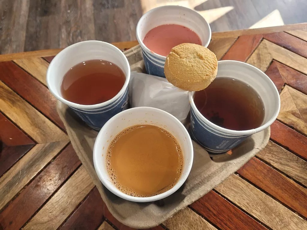 Their signature regular chai, with a base of strong spiced black tea, is creamy with an ochre hue. It’s full-bodied with a sweet and bitter finish. This is the standard, regular chai traditionally served in homes and sold by chaiwallahs, tea makers, across the South Asian subcontinent.