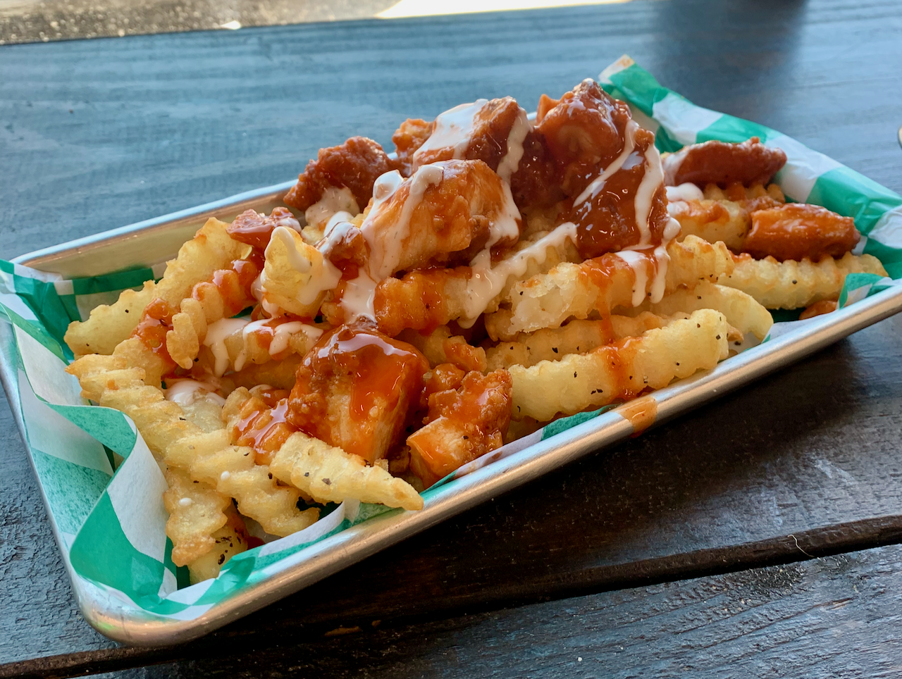 For a more over-the-top side, you can also order the Buffalo chicken fries ($10), which are topped with buffalo sauce, ranch and Buffalo chicken bites. We were tempted to ask for a fork, but this isn’t the kind of place where anyone will judge you for digging in with your hands. More sauce would’ve been nice for this side, but ketchup and “slap sauce” are available.