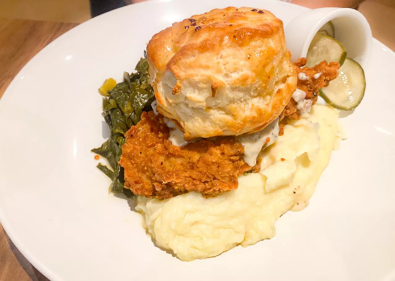 Smoky fried chicken over mashed potatoes and fresh biscuit at Café Momentum.