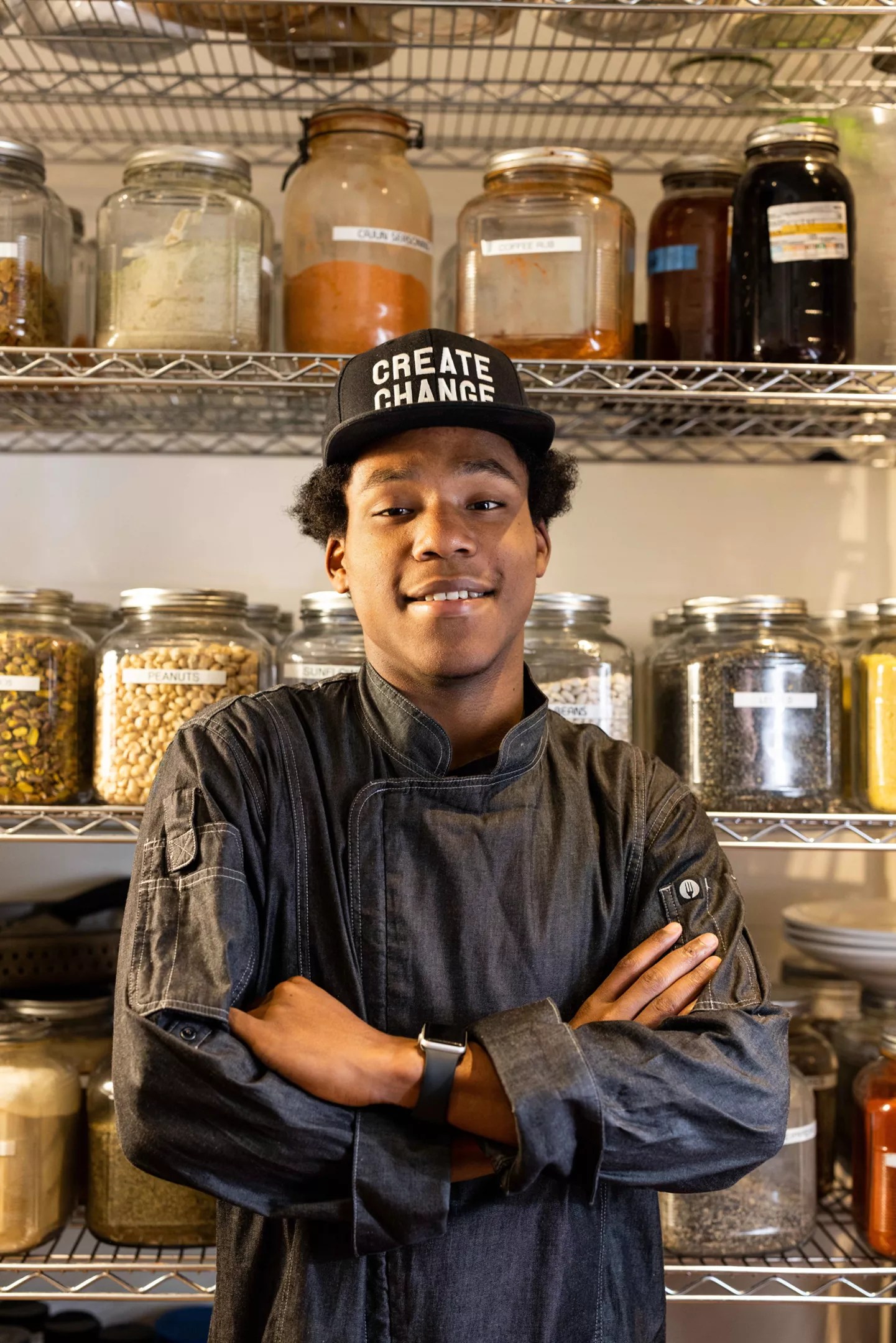 Brian is another current intern. He’s 17 and is wearing Houndstooth chef pants and a white snap-up chef’s shirt. He joined the internship program in 2021; he was out for a while but returned and is on schedule to graduate later this year.