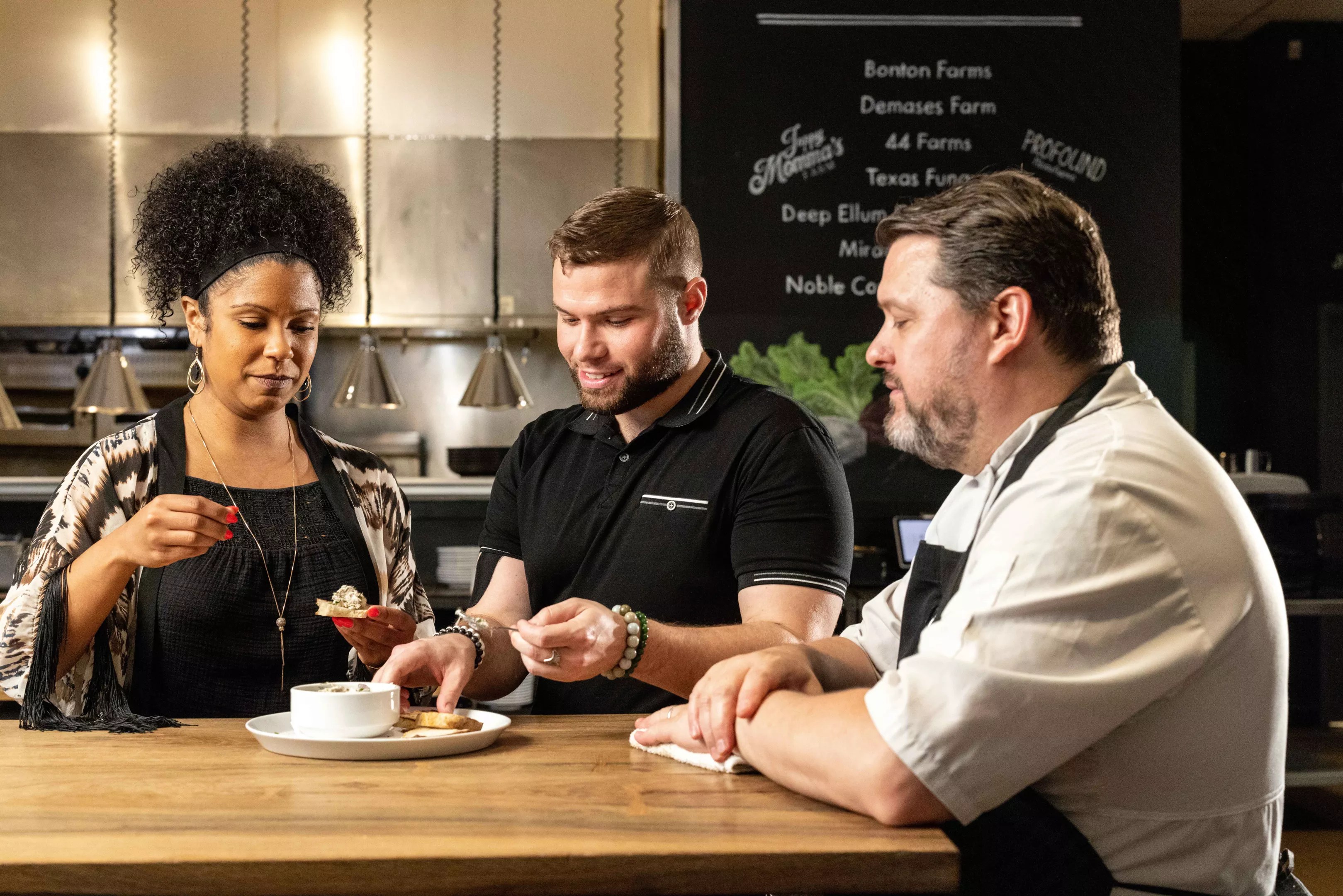 Restaurant program manager Tyreesh Browning, service training manager Conner Boyett, and chef Aaron Collins discuss a white fish dish.