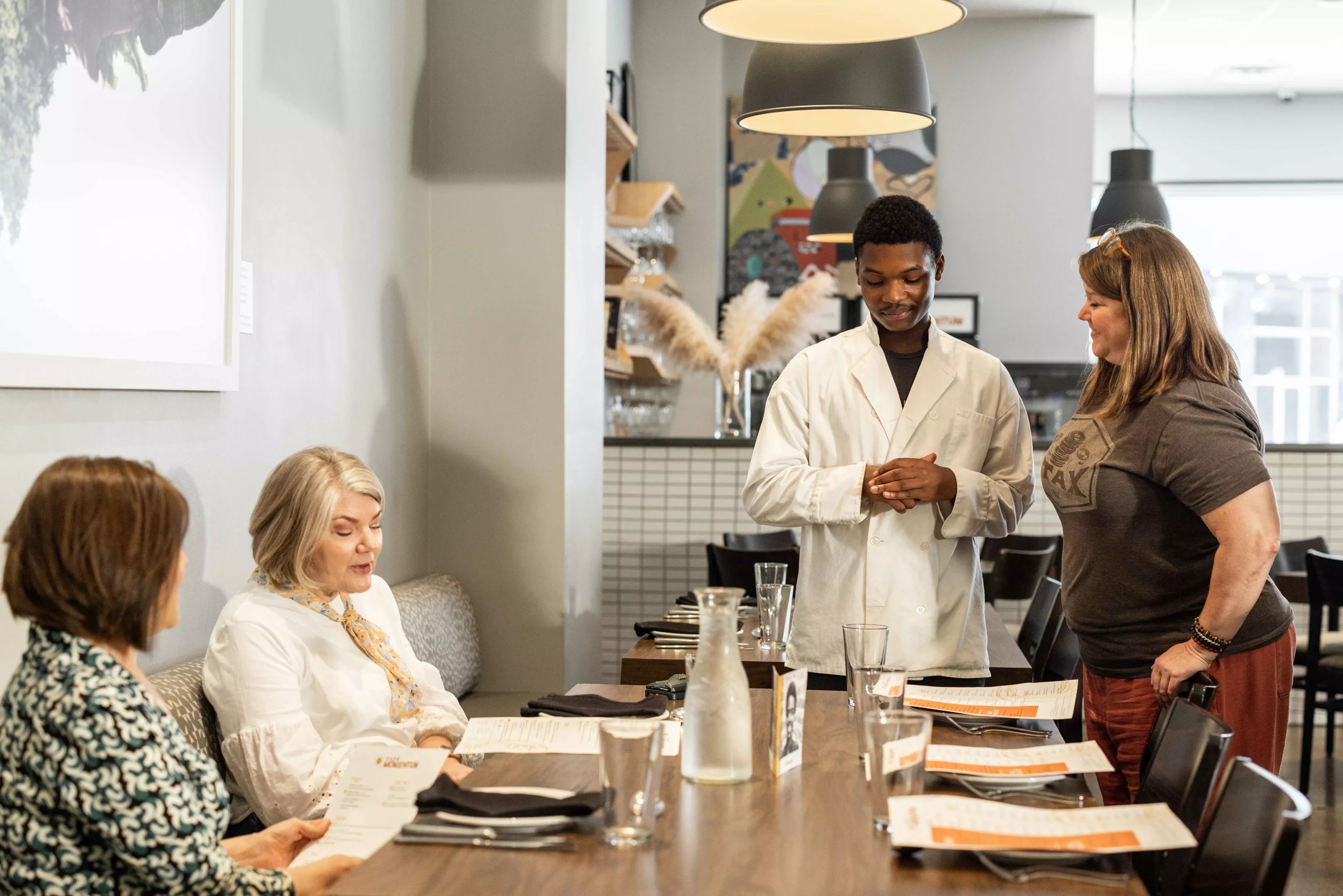 The customers are important too. Brian says at first he was wary of talking to those who came to dine. A manager worked with him, demonstrating how to introduce himself and explain the program. (Every customer gets a quick rundown about the restaurant.) Brian learned to enjoy the interactions, and his confidence grew. Now he trains new interns on the process, explaining what they need to cover before telling them, “Just say it in your own words now.”