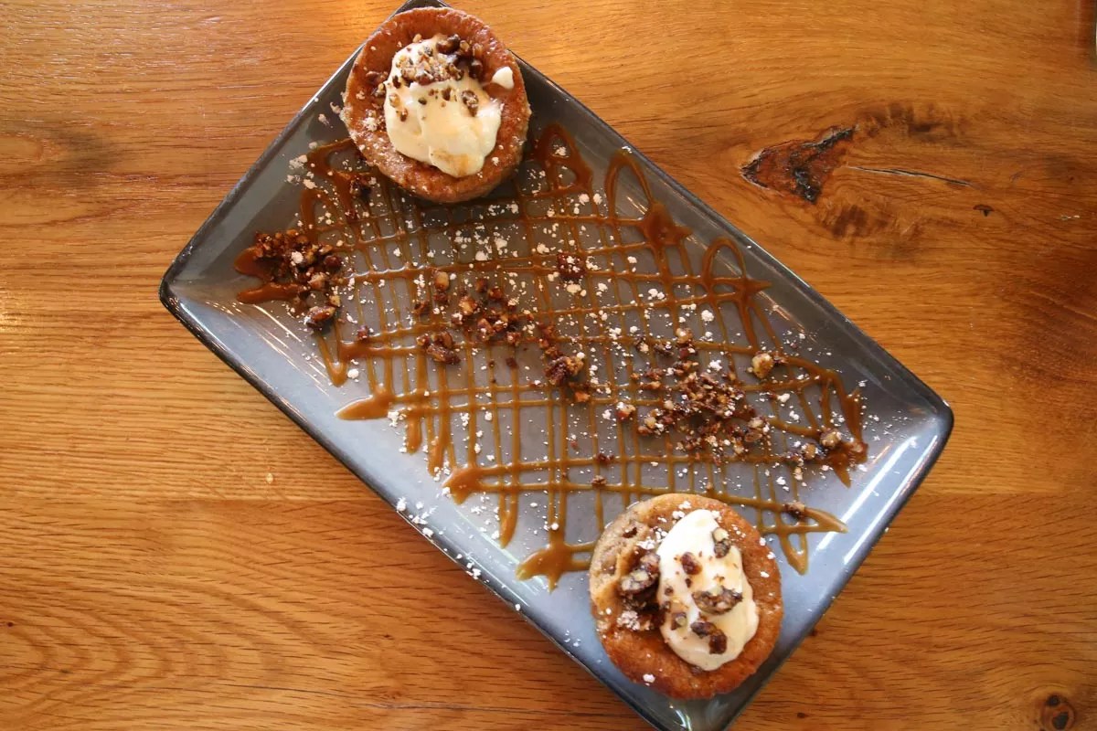 The brunch menu is pared down from the larger menu, but several items are simply carryovers. Under the appetizers section, the deviled eggs and smoked salmon are holdovers that can be ordered any time. So is the brisket queso ($9.50), but we couldn’t resist the idea of queso and brisket for brunch. We also started with a pair of the cinnamon bites ($6), which were two mini muffins made from a cinnamon pecan cake and doused with a creamy vanilla frosting. The muffins are served warm and were a perfect not-too-sweet start to the meal.