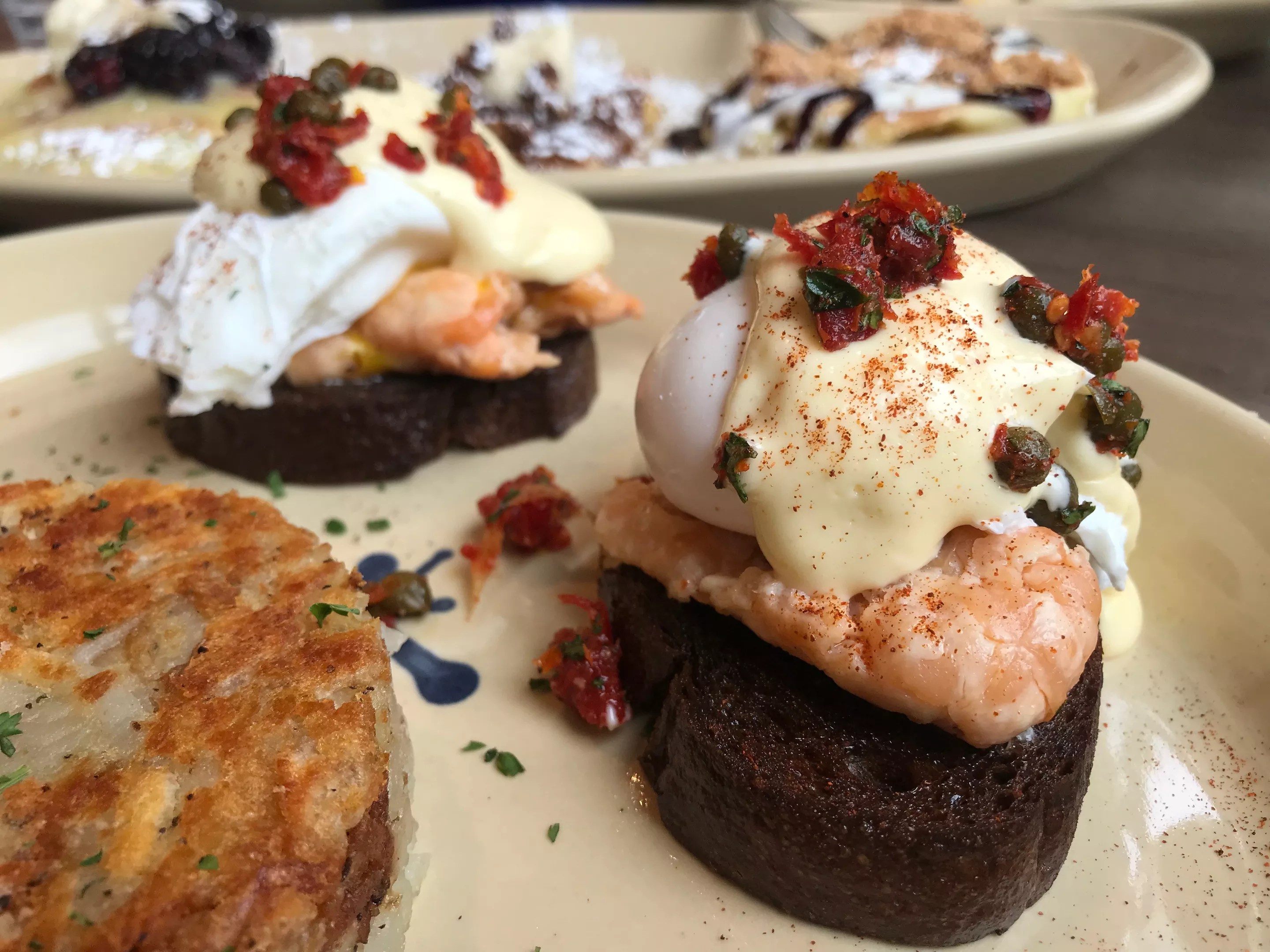 The Benny Goodman is a fun twist on lox, with salmon, poached eggs, caper relish and hollandaise over toasted rye.