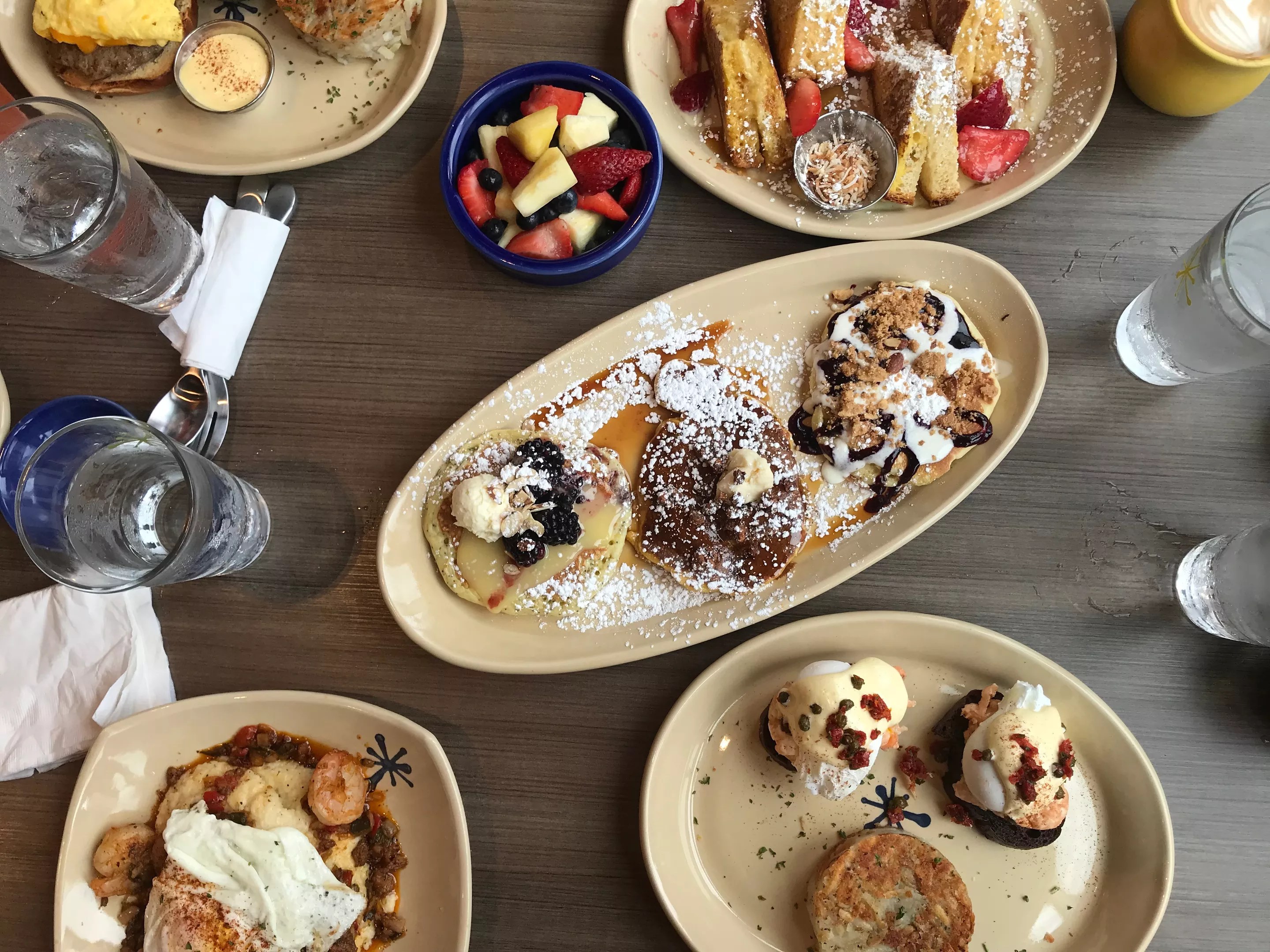 From pancake flights (center) to brioche French toast and shrimp and grits, Snooze’s brunch menu is inventive and playful.