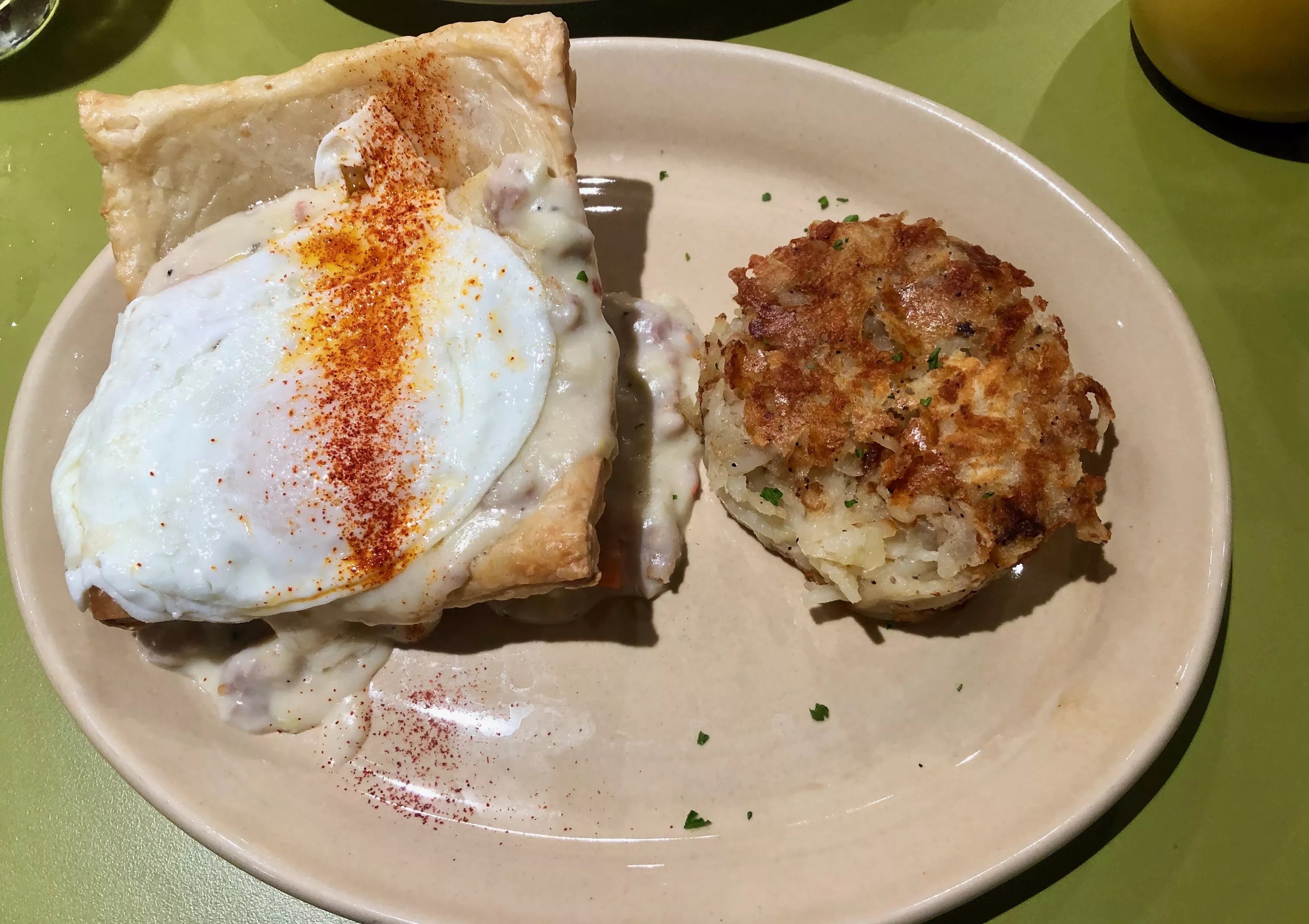 There’s a breakfast pot pie ($10) that has all the necessary parts of a chicken pot pie: gravy and puff pastry. Instead of chicken, you have a sausage gravy, but one that still has plenty of rosemary and tastes like the pot pie gravy you love. Slopped over a pastry and topped with an egg, it’s not the cutest plate, but it’s pretty satisfying. And the stack of hash browns that comes with this and plenty of other dishes is well done.