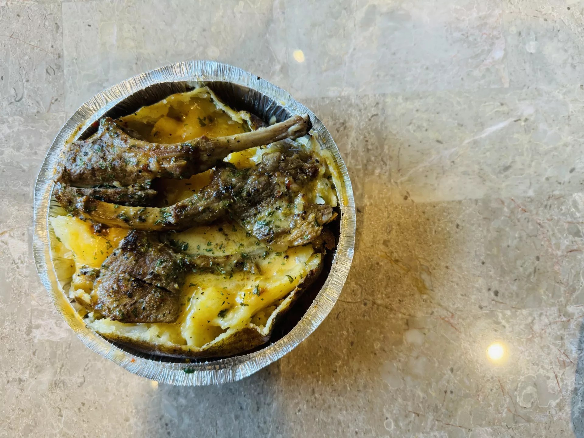 We grabbed a couple of baked potato dishes (and a refreshing blueberry mint lemonade) after speaking with Scott, who has a smile that will illuminate any room and is about as personable as can be. The weekly special was The Chop Pot ($25), featuring three beautifully marinated lamb chops, seared and resting over a bed of cheese and POT Cajun cream sauce.
