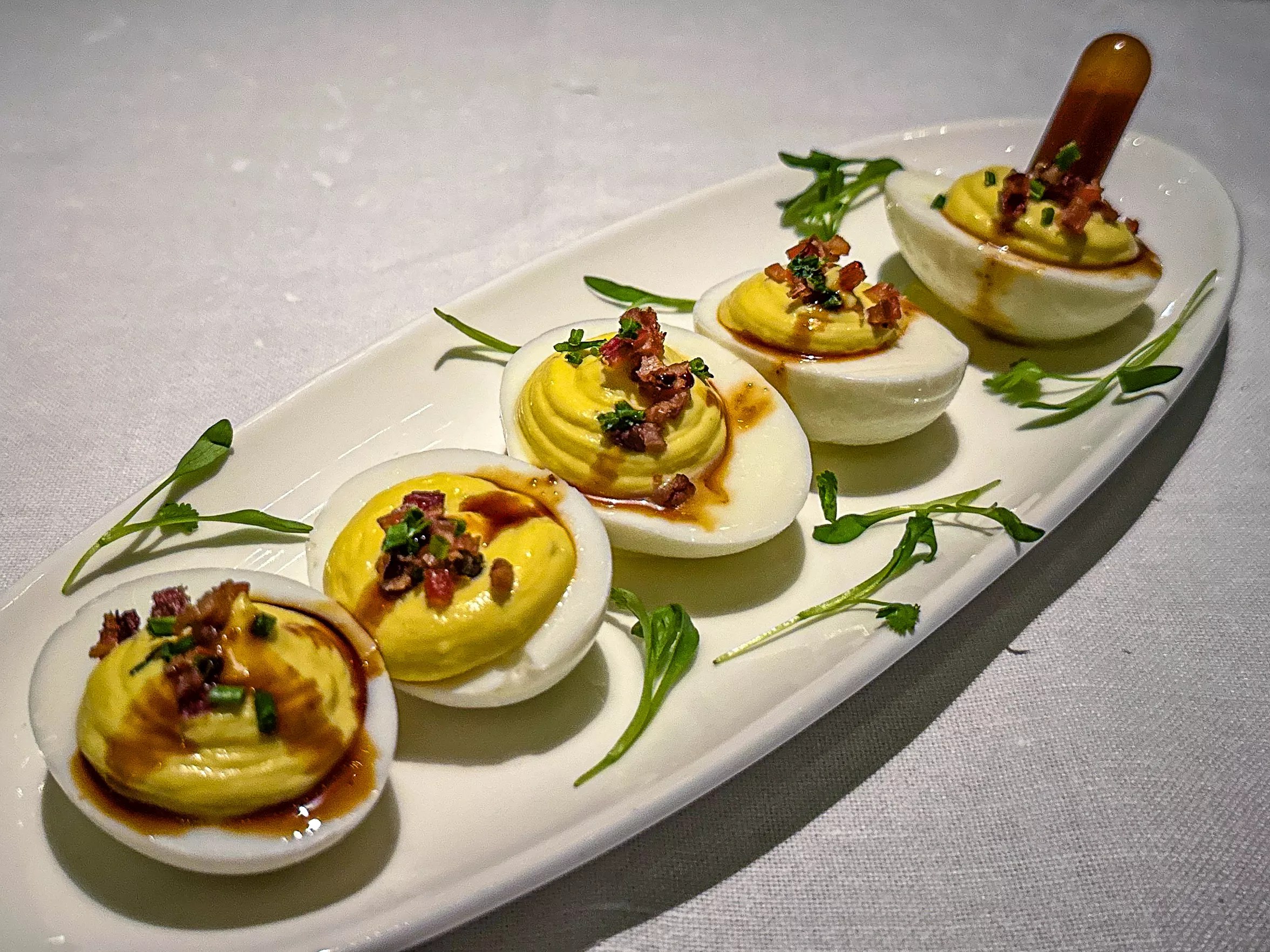 Deviled eggs with candied bacon, chives and black garlic hot sauce.