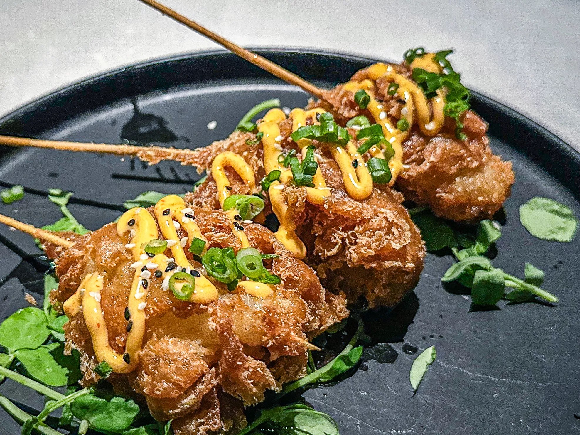 Tempura lobster tail in bang bang sauce with sesame seeds and scallions.