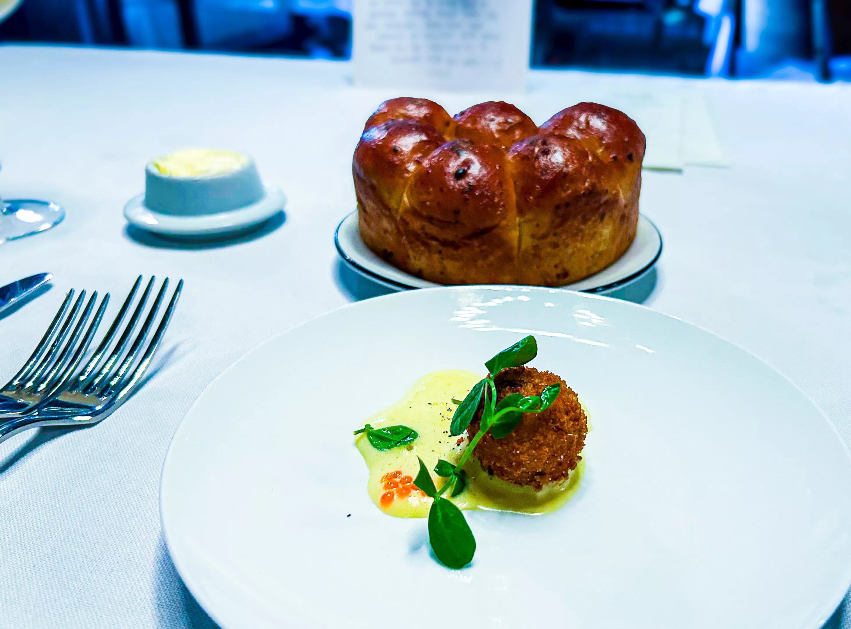 We were quickly brought a full loaf of delicious bread along with a crab croquette amuse bouche to get us started. We resisted eating the whole loaf, and found a great opportunity to enjoy it later. The seven courses proceeded to follow one after another at a leisurely pace.