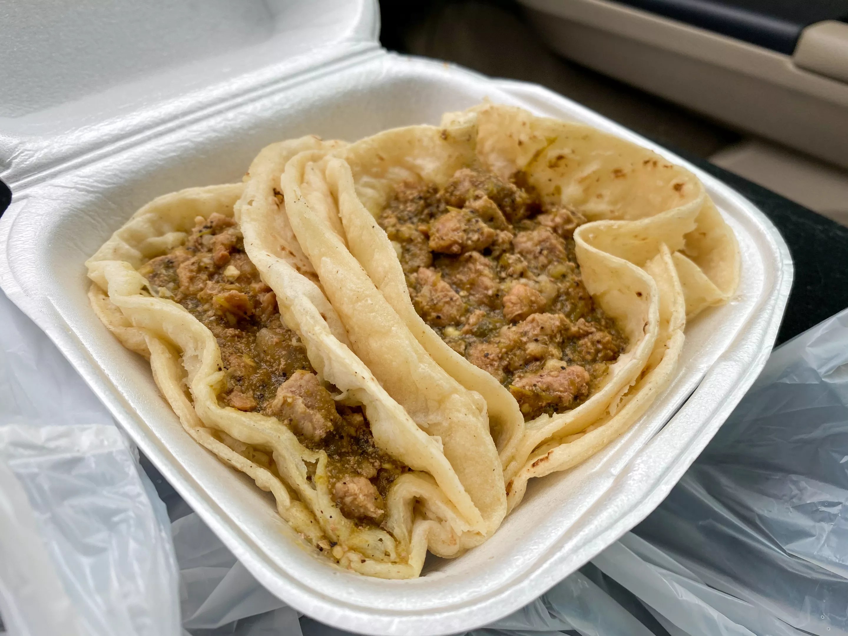 As you eat, the double tortilla may fall apart. This is a good reason to eat straight over the Styrofoam container (our visit was on a rainy day, so all of this mess happened inside a parked car). At that point, just look at it as it is – guisado – and tear off parts of your tortilla to scoop up the stew into the perfect bite.