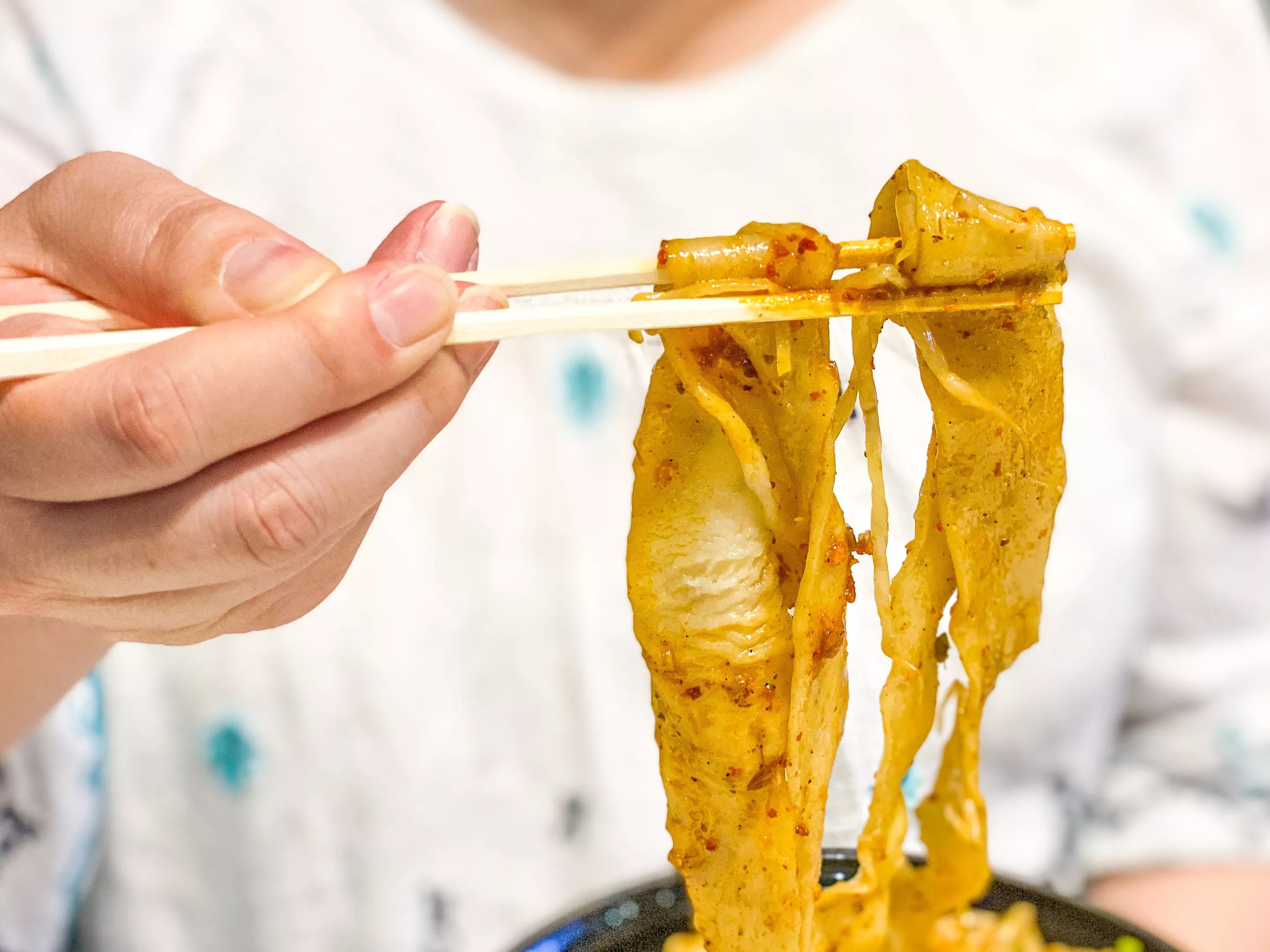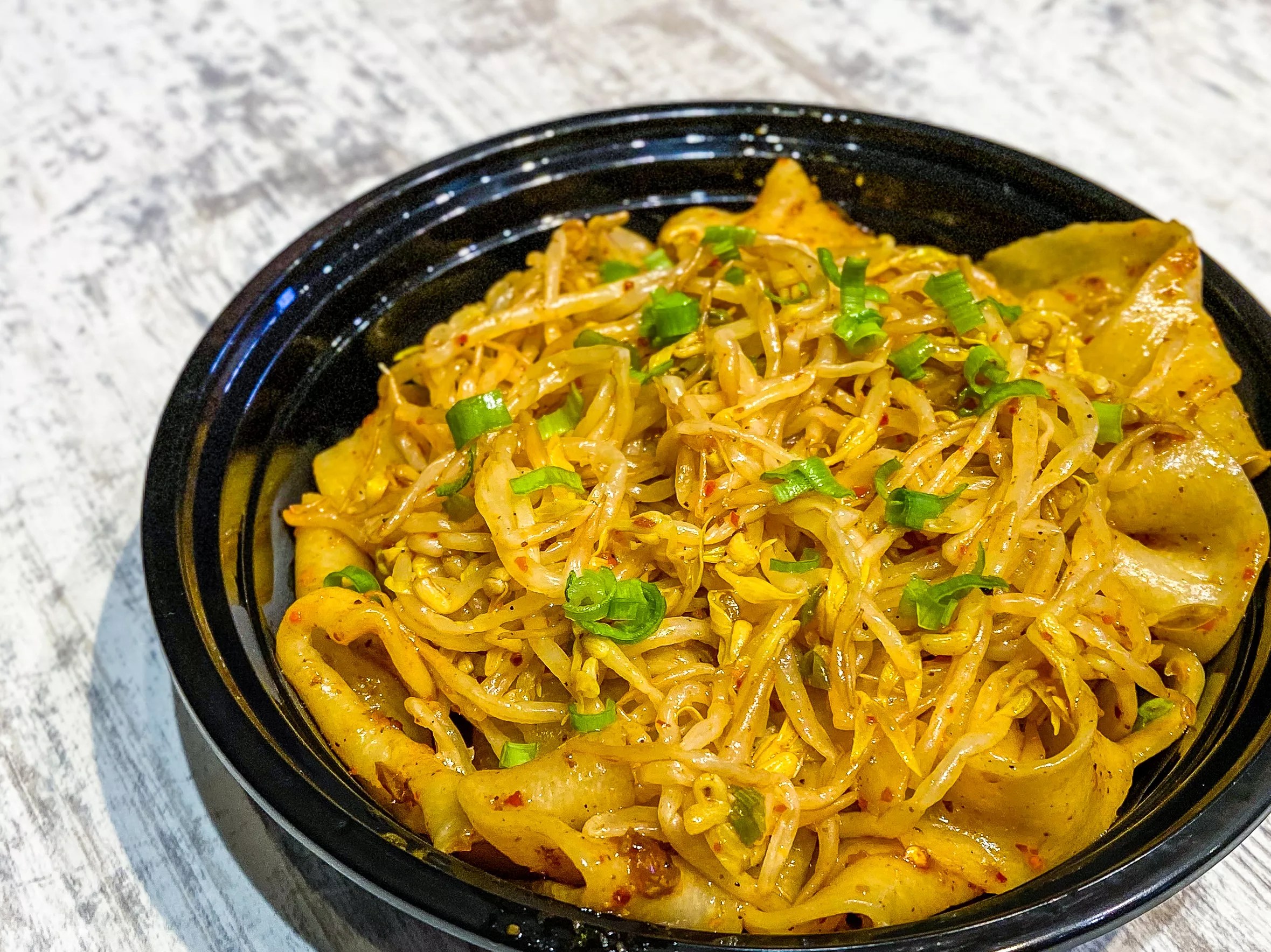 Biang biang are long, wide, wheat flour-based, hand-pulled noodles, seasoned with a Chinese black vinegar base sauce and topped with garlic chili oil