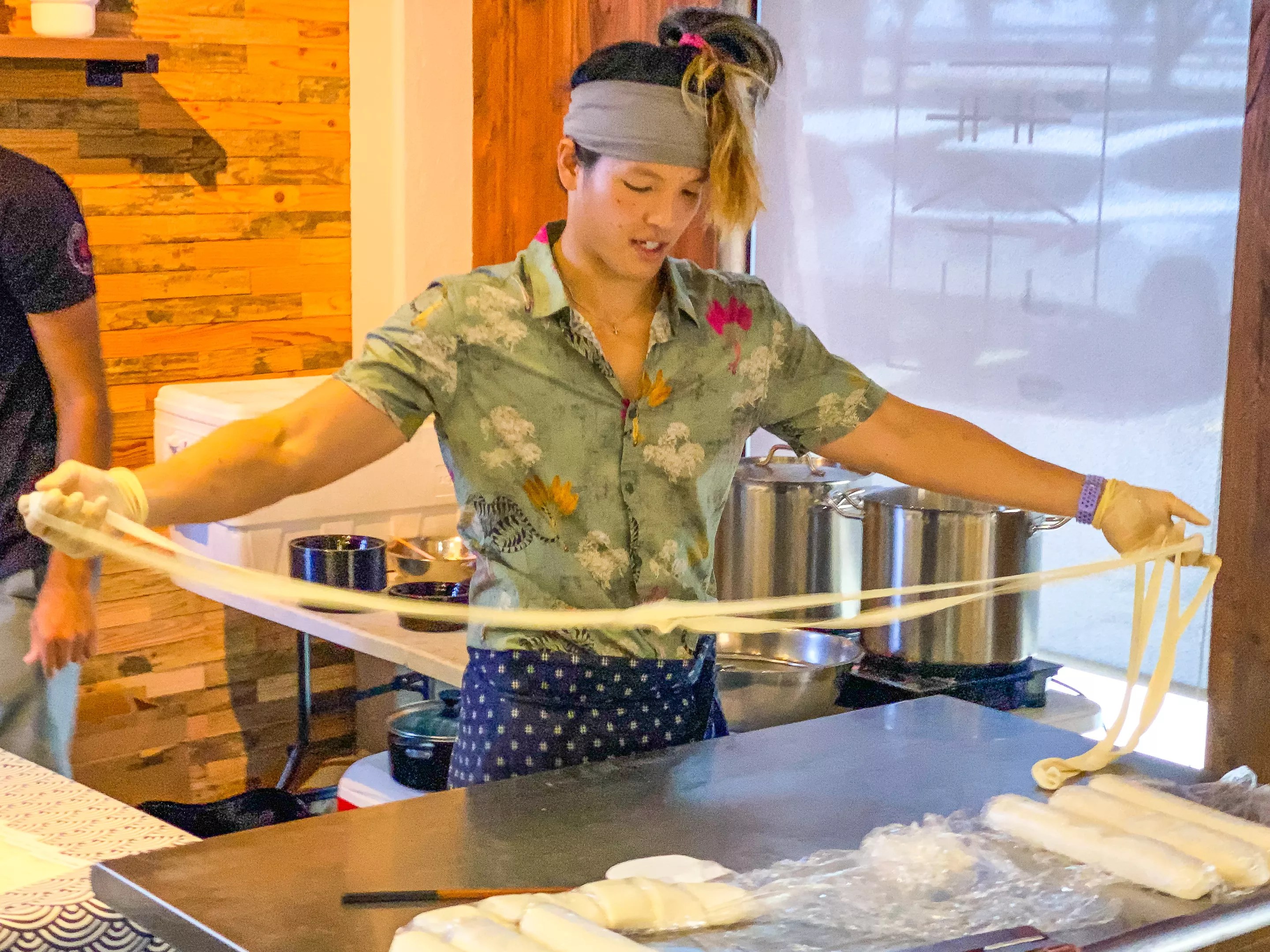 Food was still foremost in his mind, however. After seeing a YouTube video of a noodle puller, he dove headfirst into this art, practicing daily for weeks before finally preparing some noodles for friends at home. Eventually, tennis coaching took a back seat to the fine art of noodle pulling, and TeaGu Café was born using the pop-up model.