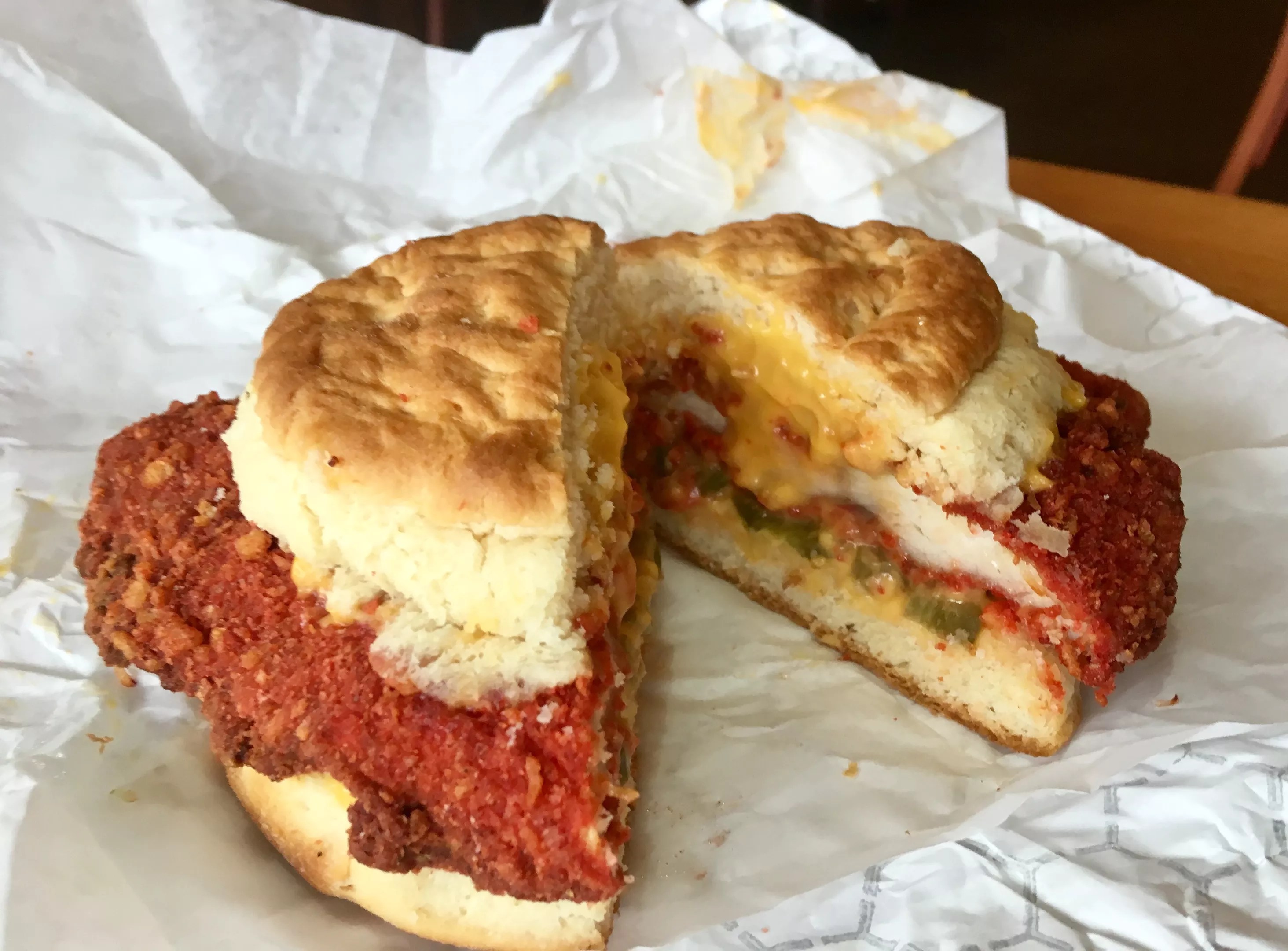 If you’re a Flamin’ Hot Cheetos fan, this Hypnotic Biscuits sandwich is for you.