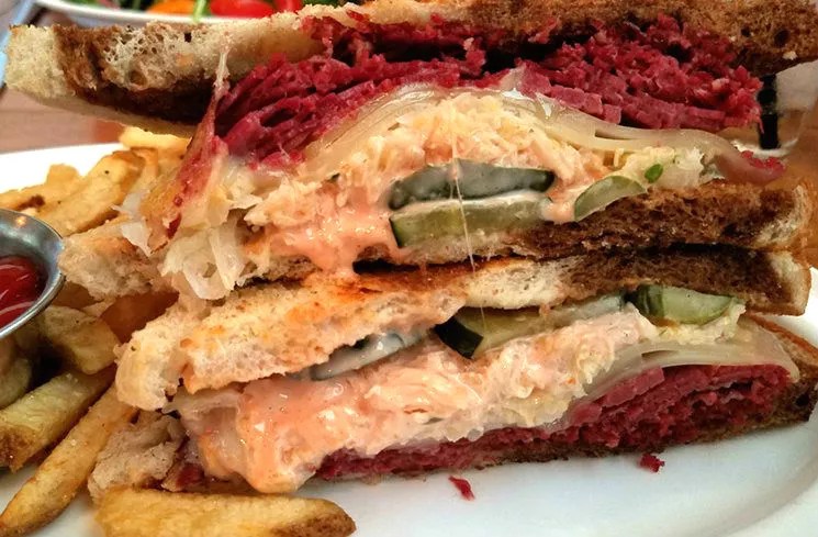 Oddfellows’ Reuben flies in the face of deli-style stack o’ meat Reubens by placing equal importance on each element of the sandwich.There are thick slices of fresh, marbled rye, grilled just as the Reuben’s hotly debated creator, Bernard Schimmel, did when he prepared this sandwich for the first time. The bread is key; it helps maintain order while a thick slick of Thousand Island and sauerkraut do their best to undermine the integrity of the sandwich. And where the bread provides stability, the ‘kraut and thick, crunchy housemade pickles provide freshness and tang, helping to balance this otherwise very rich meal. A refreshingly restrained layer of salty corned beef and nutty, creamy Swiss cheese also help achieve this balance.