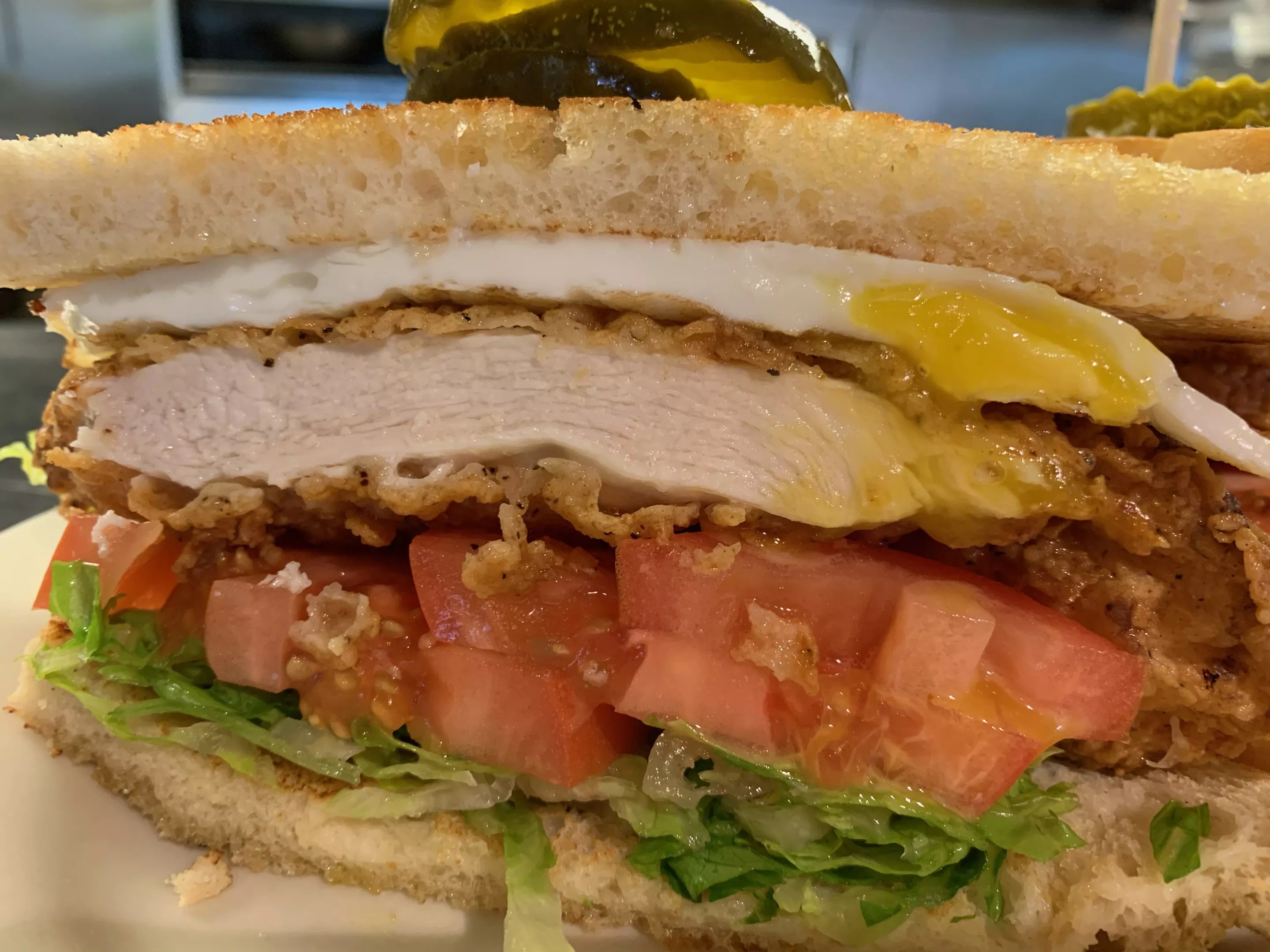 Chicken breast is showered with chili powder, paprika, garlic and onion powders, salt and pepper. Once the chicken is deep-fried to a fashionable crisp, it sits on heavily buttered and grilled bread. Two fried eggs, good sunset-yellow yolks, rocket this Dallas-diner-classic into the upper atmosphere. Important note: The sourdough is griddled on both sides, leaving a sort of four-dimensional butter-crunch on each bite.