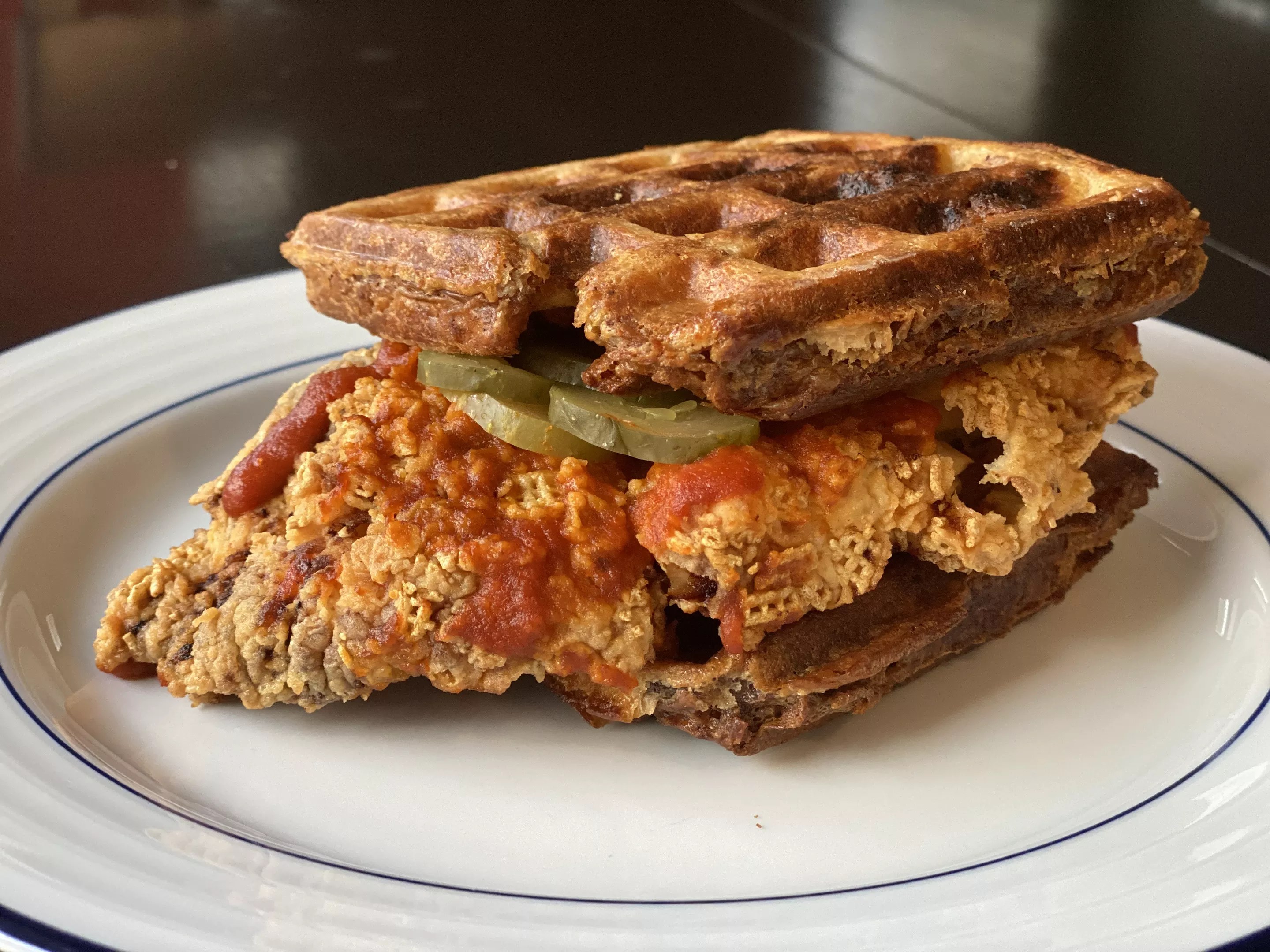 “Then there’s the waffle, which stands in perfectly for the bread of the sandwich. It’s fluffy and just ever-so-slightly sweet and holds the chicken and pickles in place nicely.”