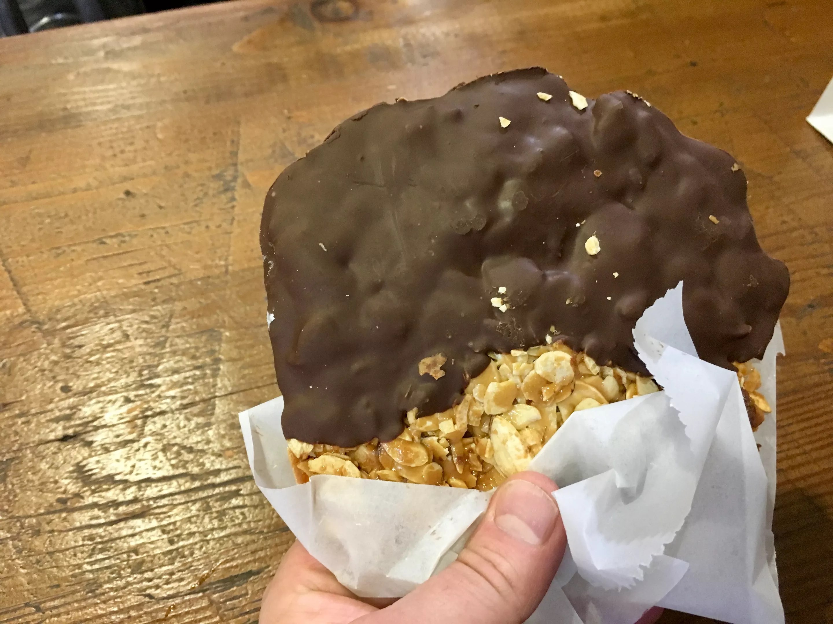 One hidden gem among the cake slices is the giant Florentine cookie, made with shaved almonds, sticky and pressed into a sharp circle that’s about the size of a go-kart steering wheel. Half of the thin almond cookie is dipped in dark chocolate, which melts between a thumb and forefinger at normal body temperature. If you brought your fist down on the Florentine, it’d bust into shards that you could instantly weaponize. Throw it whole like a ninja star if you’re about to be mugged. It’s sweet, a little salty and oh-so crunchy. The chocolate fuses to the almonds while it melts. It’s a superb handheld dessert.