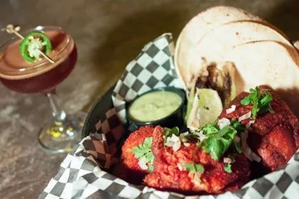 Naked chicken at Brick & Bones is a stunner of a starter. Chicken brines and gets fried without breading, armoring the skin with crispness. It’s served like a deconstructed street taco with corn tortillas, salsa verde and the classic taco garnish of cilantro and diced onion. It’s like a carnivore’s bouquet of flowers, and who doesn’t love flowers? Ask for an extra side of grilled scallions. Grill char soaks into the stalks, and they’re umami enough that they act as their own meal if you’re veggie-minded.