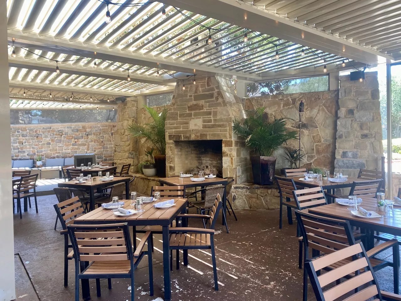 The large, climate-controlled stone patio at The Fifth.