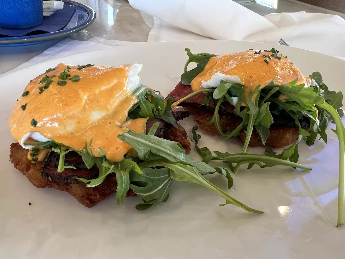We also ordered a wagyu pastrami Benedict served with de rigueur poached eggs, topped with greens and a chipotle béarnaise sauce for extra zing. Instead of an English muffin, the tender slices of pastrami were nestled atop discs of crispy hash browns. We found the twists on the common Benedict a delight, and quickly plowed through our plate. Sadly, as this story went to press, the Benedict has been nixed from the menu, although a wagyu chicken fried steak ($24) looks like another hearty option to try on our next visit.