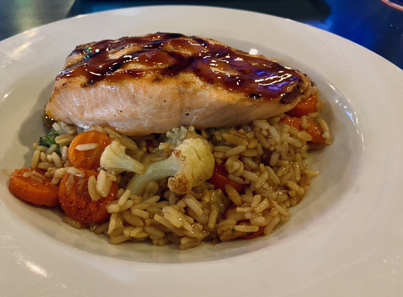 You know you’ve found a proper Texas establishment when there is a dedicated “keep it light section” on the menu, and that section includes street tacos. We went with the salmon rice bowl, which came recommended. The thick salmon filet had a nice flake and a light dressing of teriyaki sauce. The rice and vegetables were fresh as well.